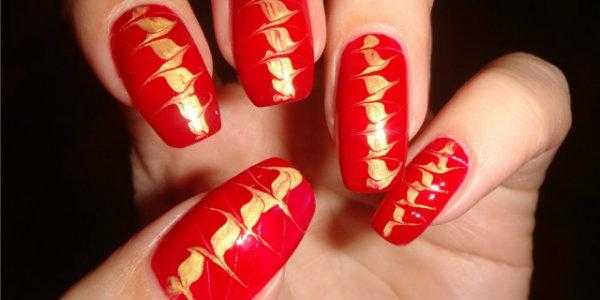 Двенадцатое место модного nail-ТОПа, делят между собой красный дизайн с украшением паутинкой и втиркой.