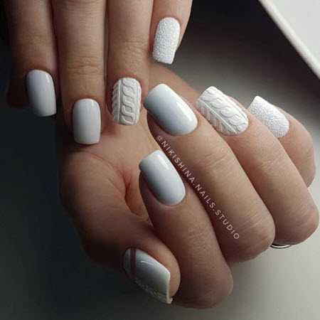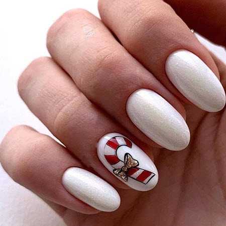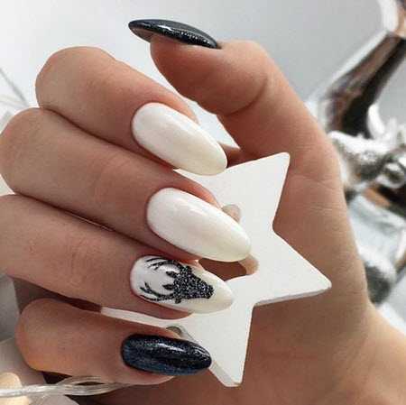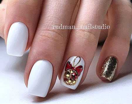 Белый цвет лака сочетается с многими оттенками лаков, этот цвет не выходит из моды, и с ним можно сделать множество разных вариантов новогоднего маникюра, добавив к нему рисунок, камушки и блестки.