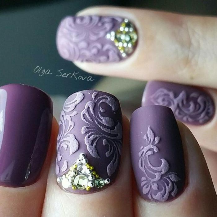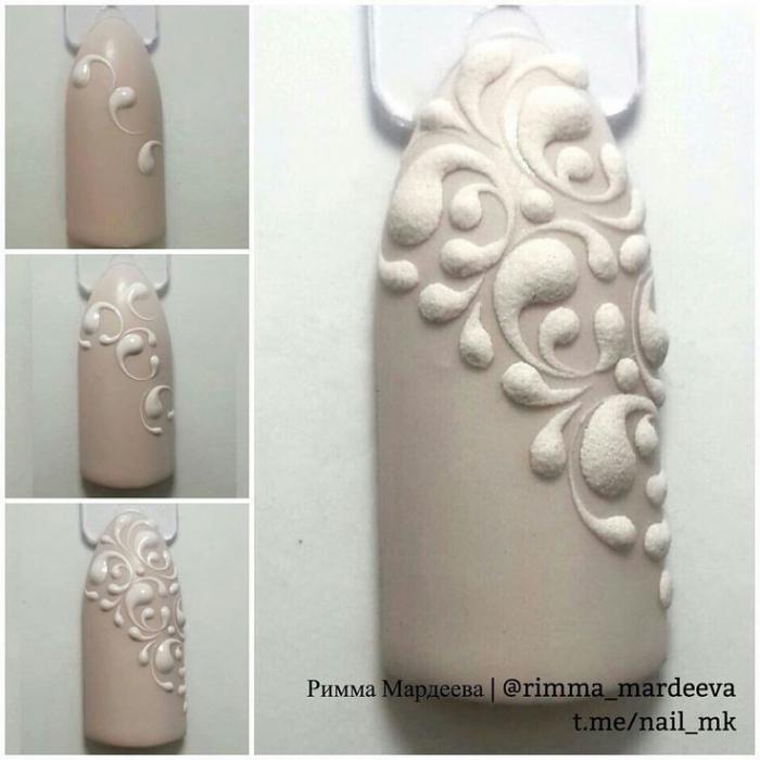 Безусловным бонусом такого дизайна ногтей является то, что можно сверху нанести цветной лак. А позже, стерев цветной лак (без использования средств, содержащих ацетон), на ваших ногтях снова появится объёмный рисунок.