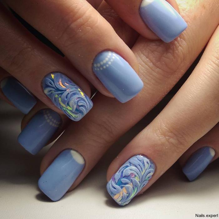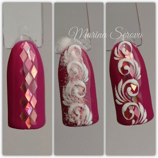 - Добавление в нейл дизайн тематических рисунков, «зимних» тонов, блестящего декора.