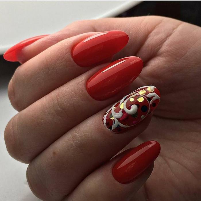 Красный лак — идеальный вариант для новогоднего маникюра 2021, насыщенный глубокий красный подойдет практически к любому наряду. Красный цвет хорошо сочетается с золотом и белым, а это главные цвета новогоднего маникюра. Самые топовые идеи красного новогоднего маникюра смотрите на фото: