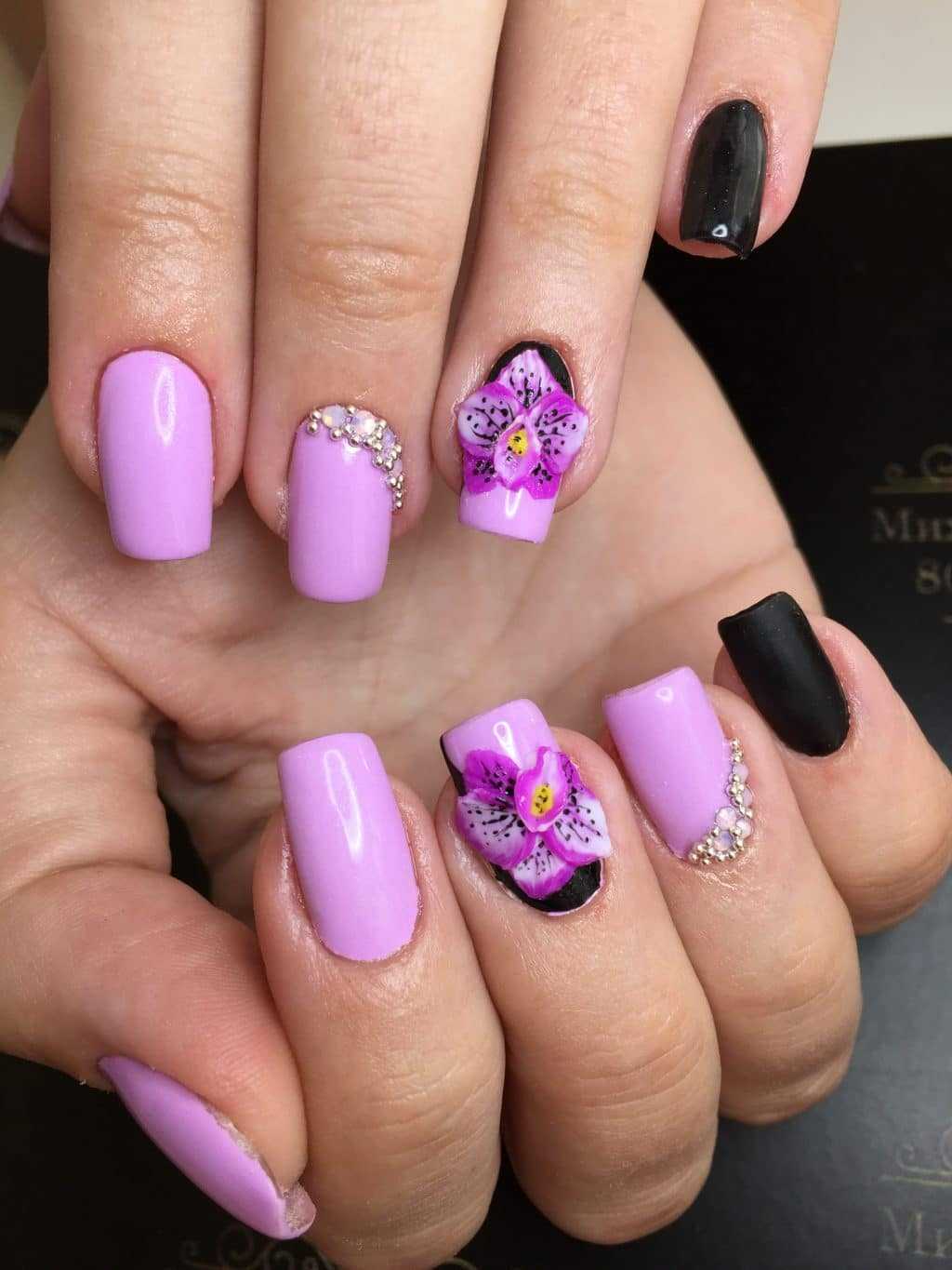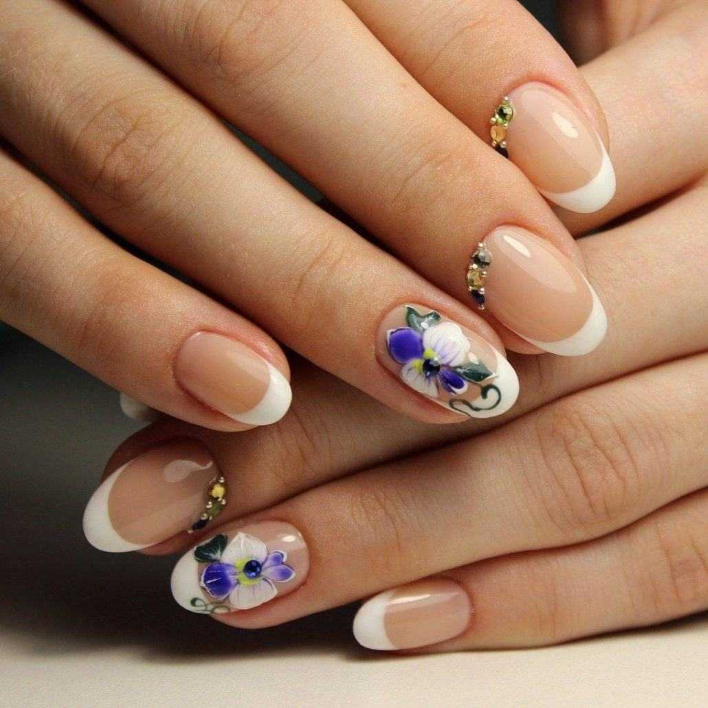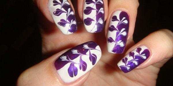 Работать с акварелью умеют не все мастера, поэтому если вы решили выполнить такой дизайн, заранее поинтересуйтесь у мастера о его опыте. Акварельный маникюр выполняется в светлых тонах, главным из которых является белый. На белом фоне цветы смотрятся очень мягко и сдержанно. Для изображения цветов используется фиолетовый и розовый цвета с многочисленными полутонами.