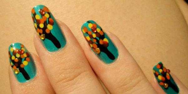 Когда цветочные мотивы в различных вариациях уже не вызывают затруднений можно попробовать маникюр с перьями. На основном покрытии делаются три разноцветные точки по диагонали. Далее более тонкой иголкой они соединяются в единую линию. На вершине узора формируется кляксочка со штрихами.