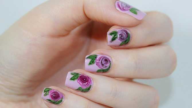 Изображение роз по влажному гелевому лаку — популярный вид дизайна. Имеется несколько вариантов рисунка: с бутонами на каждом ногте, с расположением чуть ниже маленькой розы, дополненной лепестками и шипами. Либо же можно нанести рисунок на весь ноготок. Используемая техника: