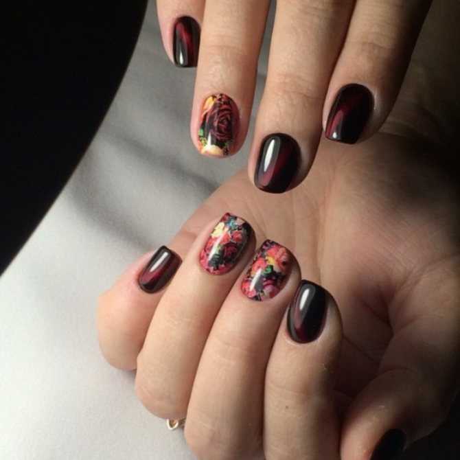 - Важным этапом является подбор цвета лаков. Красиво будут выглядеть розы на темном гель-лаке. Это сочетание будет смотреться стильно, контрастно