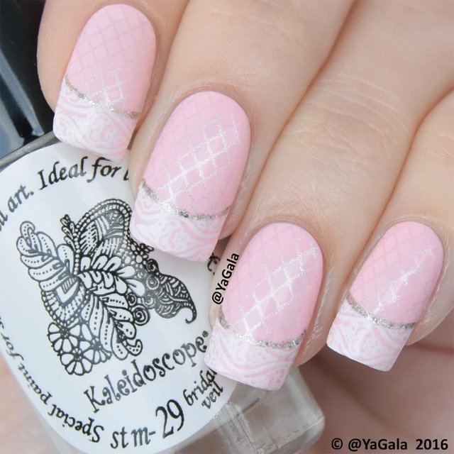 | С появлением стемпинга и прозрачных штампов, в том числе, значительно расширились возможности по созданию Как получить такой стильный дизайн ногтей, как на данном фото? Давайте разберем дизайн ногтей «Нежность» пошагово. 1 шаг — На подготовленные ногти с покрытием наносим сетчатый орнамент с помощью краски для стемпинга и прозрачного штампа; 2 шаг — Наносим белую краску на линию улыбки; 3 шаг — Подчеркиваем глиттером линию улыбки; 4 шаг — Покрываем топом для ногтей готовый дизайн, чтобы закрепить и придать ногтям глянцевый блеск. |
