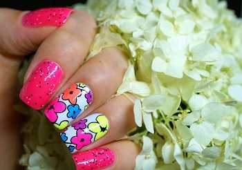 - Выберите трафарет с цветами, у которых есть крупные лепестки. Черным лаком сделайте стемпинг цветов на каждом ноготке.