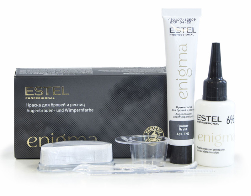 Бренд Estel давно приглянулся отечественным красавицам. Производитель выпускает качественный товар профессионального уровня по доступной цене. Estel Enigma относится к серии гипоаллергенных красок с натуральными природными оттенками. Комплектация у краски богатая – здесь вы найдете не только оксид, но и удобную щеточку для нанесения, и емкость для разведения красящих компонентов. Вымешиваются компоненты легко, спустя пять минут краска из жемчужно-белой превращается в –темно-коричневую или черную (в зависимости от выбранного оттенка).
