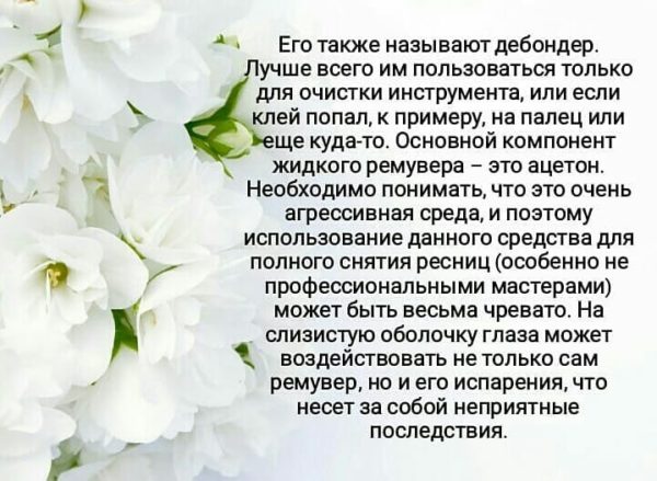 - Ремувер – препарат для снятия искусственных волокон, производители выпускают в двух видах – гелевые и кремовые. Средство растворяет клей, не вызывая раздражение оболочки глаз.