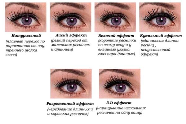 - Лисий взгляд. Эффект можно достичь путем увеличения волос от внешнего угла глаза века. Изгибы и толщина подбираются исходя из особенностей волоса.
