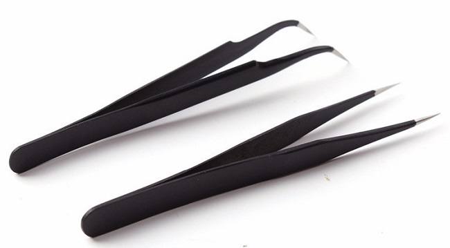 - Пинцет. Лучше использовать два вида пинцета: один с прямыми углами для наклеивания и с искривленными для корректировки.