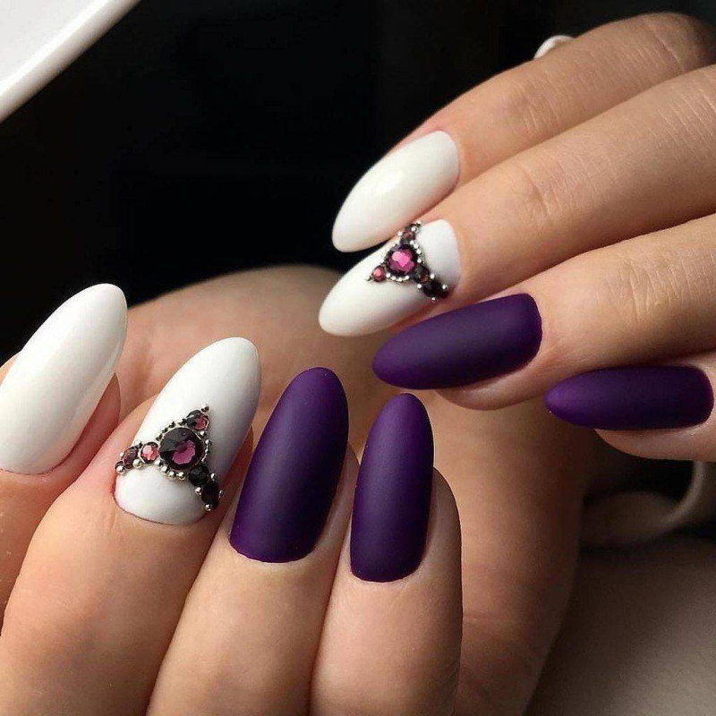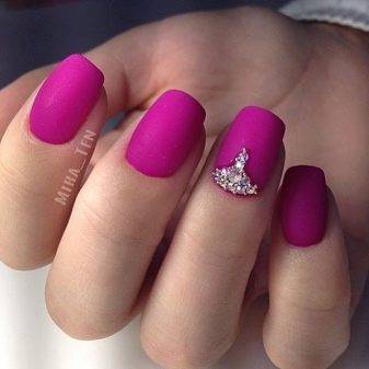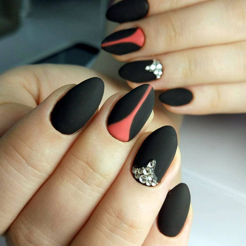 - крупные стразы в сочетании с матовым покрытием выглядят неуместно на ногтях любой длины;