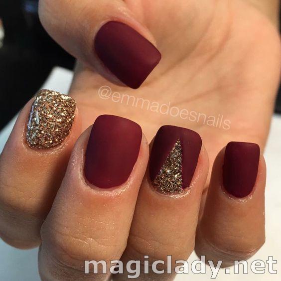 Устойчиво изысканным и современным считаются оттенки спелой вишни или бордовые гаммы в сочетании с золотом, серебром. К новогодним праздникам на ногтях популярны шиммерные блёстки и рождественские мотивы.