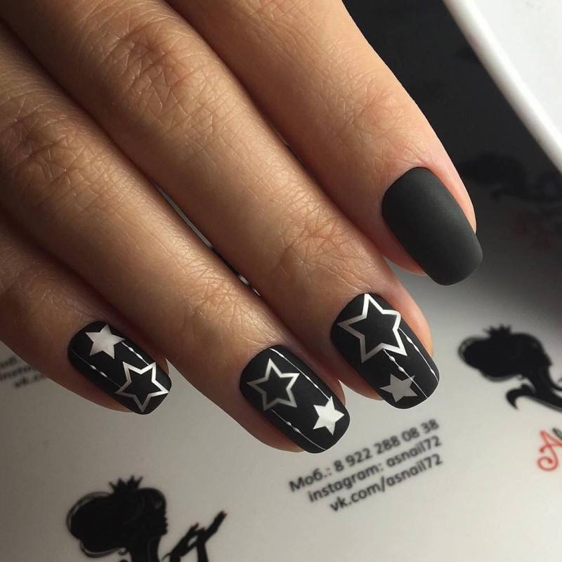 Очень впечатляюще смотрится маникюр матовый черный, особенно когда в пределах одной пластины присутствуют как глянцевые, так и матовые участки. Для того, чтобы это сделать, необходимо нанести на те участки, которые Вы хотите сделать глянцевыми, защитную основу.