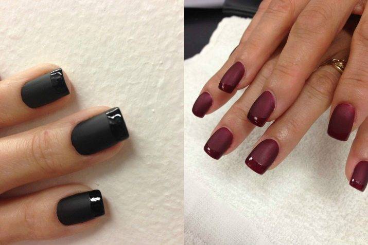 На практике существует довольно много способов оформления матового френча. Он отлично смотрится как сочетание пастельной основы со светлой линией улыбки, но в последние годы все чаще используют сочетание матовой основы и глянцевой «улыбки». В этом случае, как правило, предпочтение отдается темным тонам – черному, синему, вишневому, лиловому и темно-бордовому.