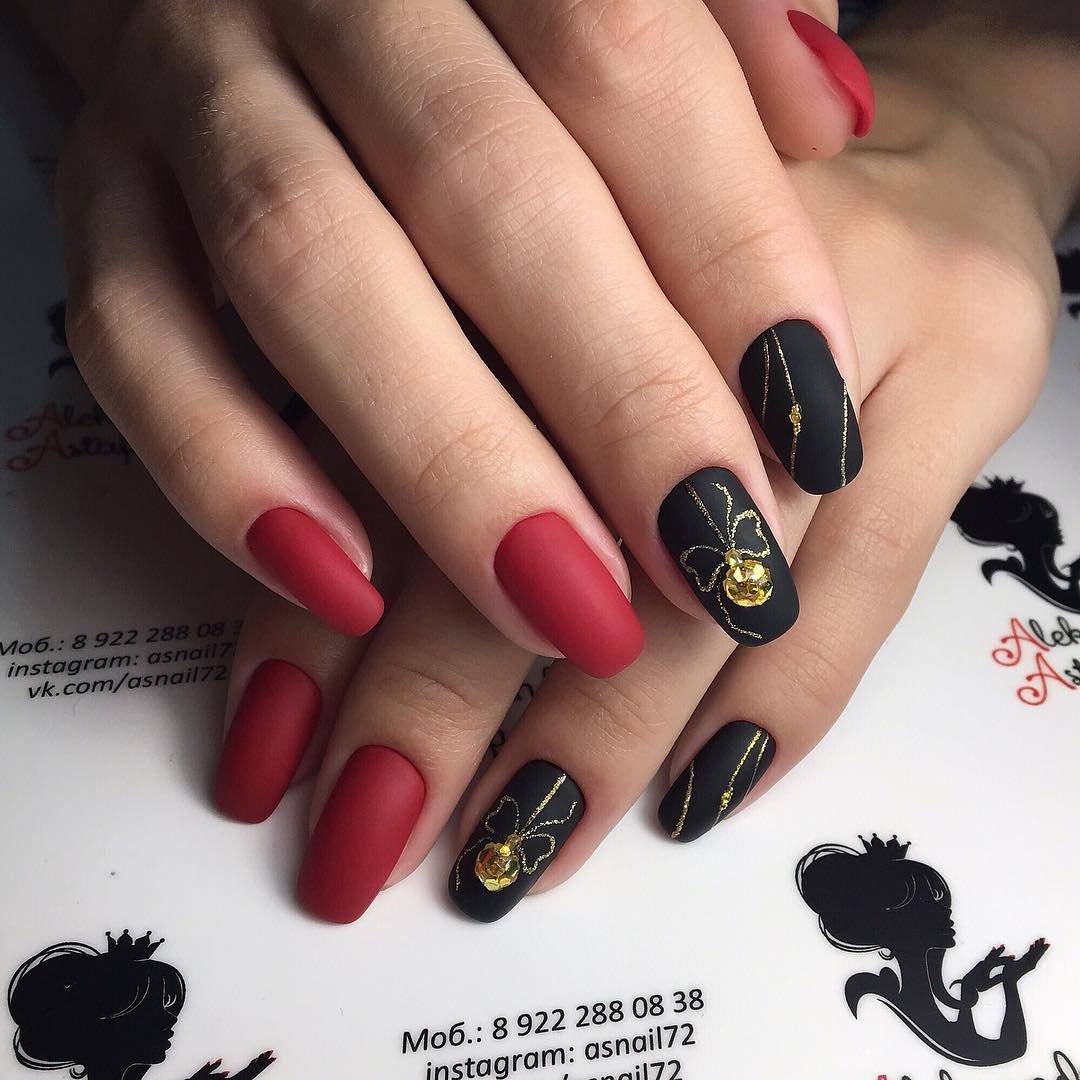Устойчиво изысканным и современным считаются оттенки спелой вишни или бордовые гаммы в сочетании с золотом, серебром. К новогодним праздникам на ногтях популярны шиммерные блёстки и рождественские мотивы.