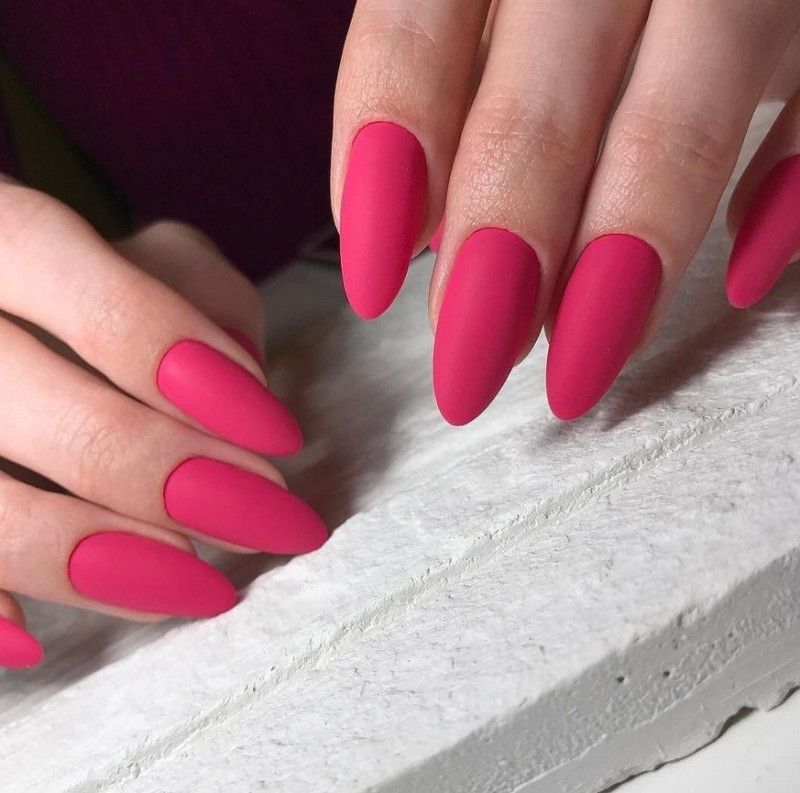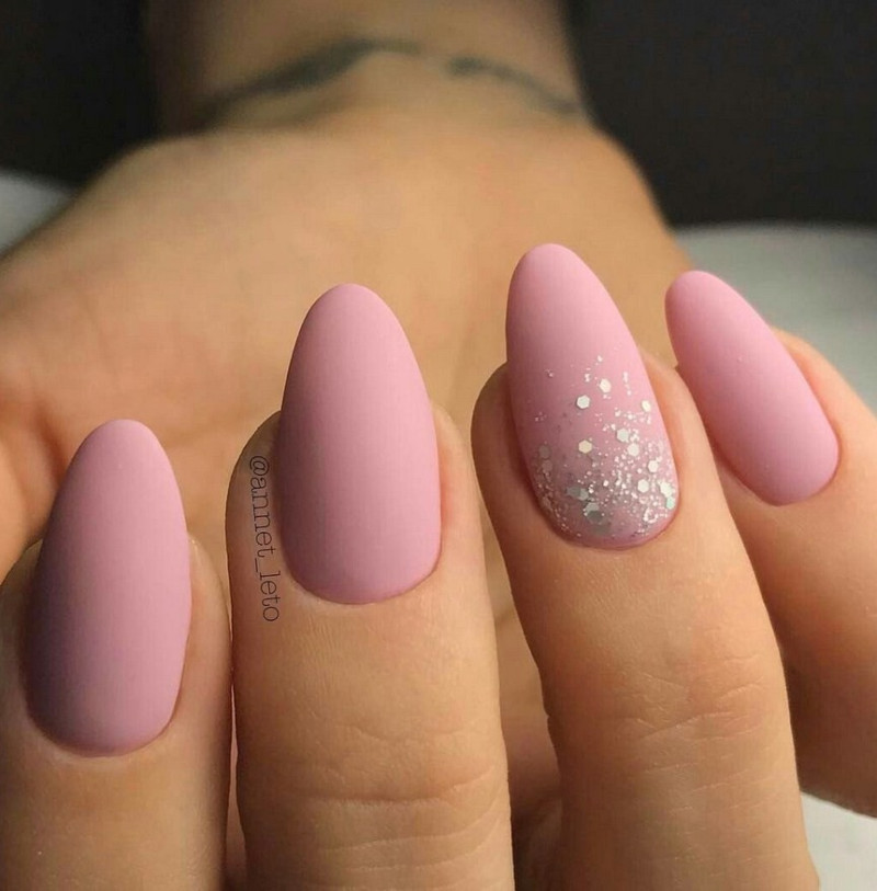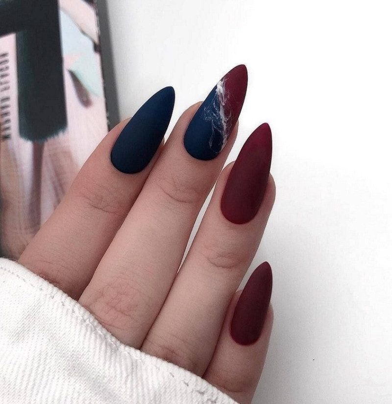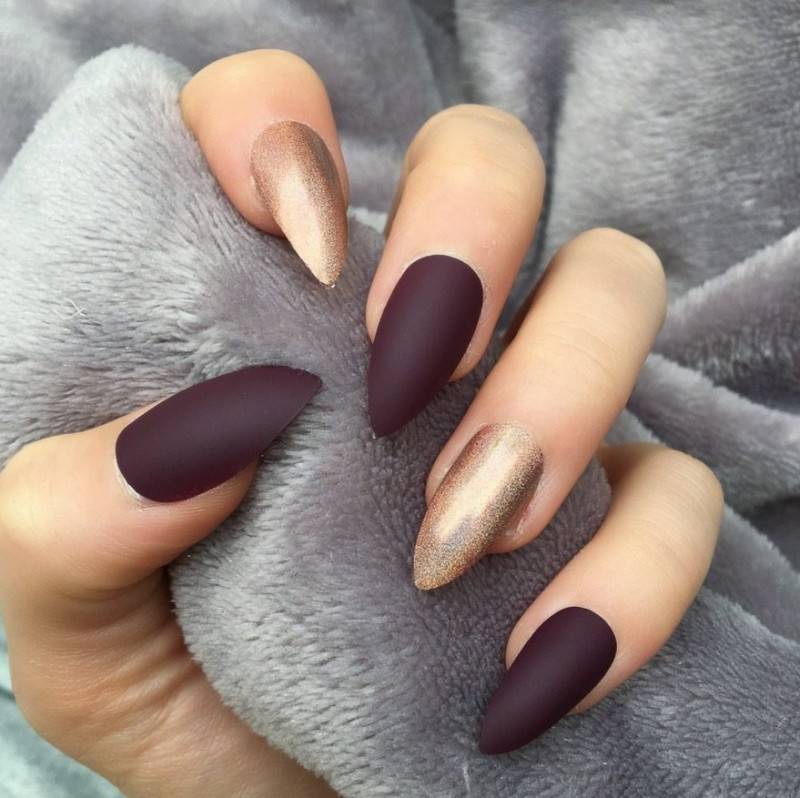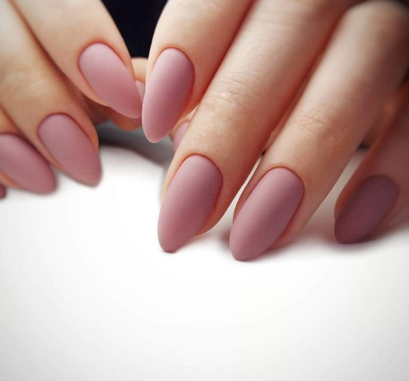 Миндаль. Такая форма сама по себе считается очень стильной, нежной и женственной. Все эти качества матированная основа только подчеркнёт и усилит. Идеальное решение – тёмные оттенки лака, которые выглядят максимально эффектно.