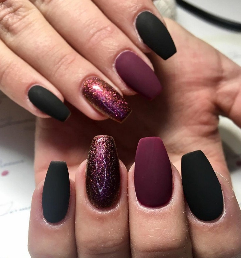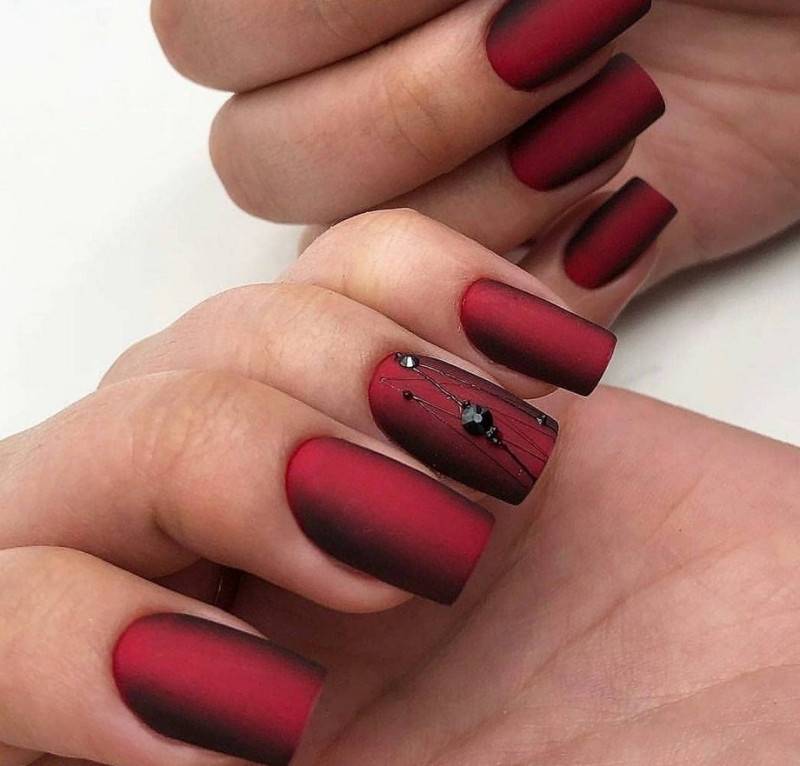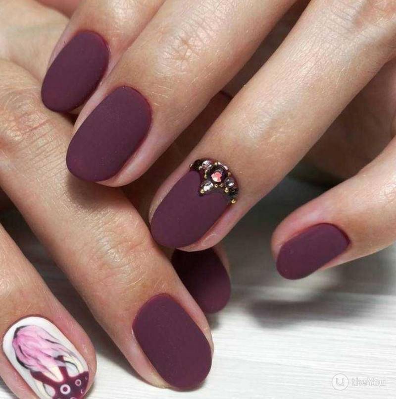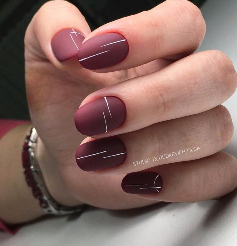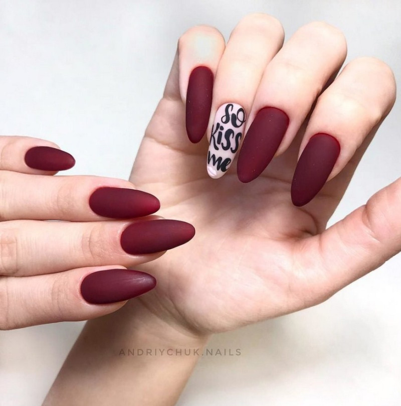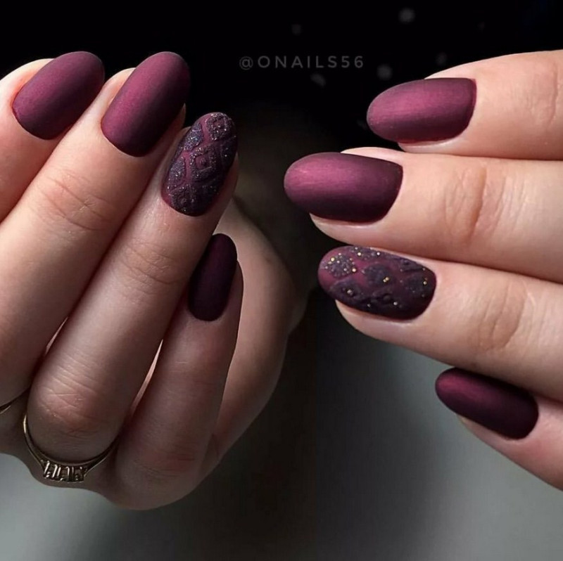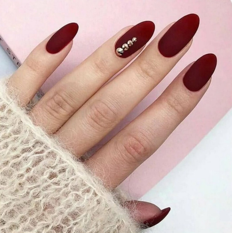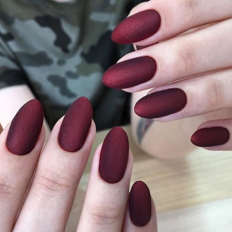 Бордовый. Тёмные, насыщенные оттенки особенно стильно визуализируются именно в матированной версии. Отсутствие блеска смягчает их, делает ещё более изысканными и элегантными. Дополнительно украсить маникюр можно акриловой пудрой.