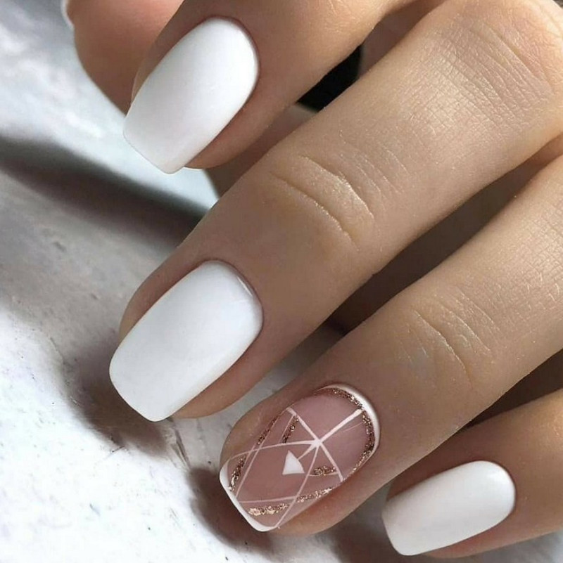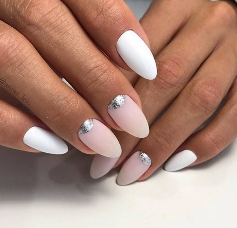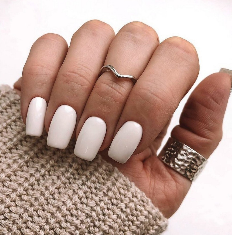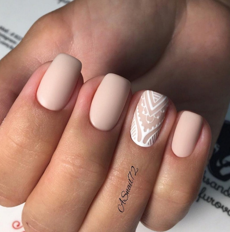 Белый. Этот цвет неизменно считается базовым, он визуально делает ногтевую пластину ровнее, изящнее. Сейчас мода диктует выполнение матирования на ноготках, поэтому все виды маникюра с белым лаком лучше применять именно в такой вариации.
