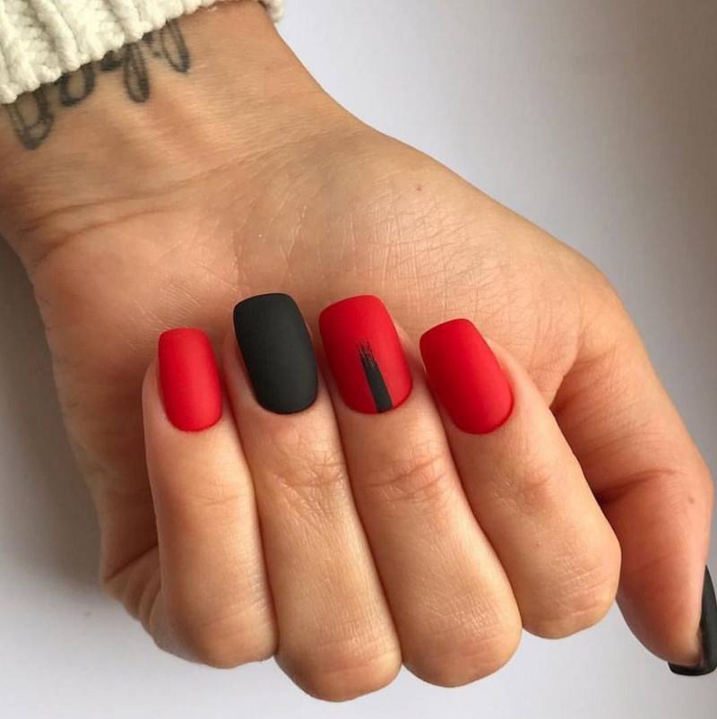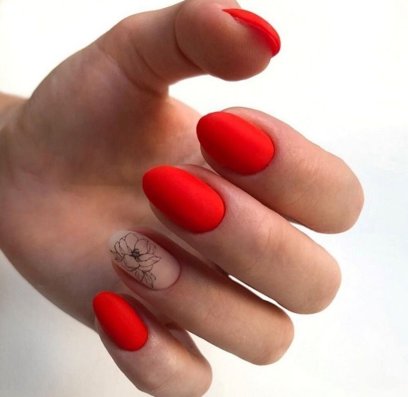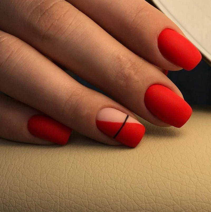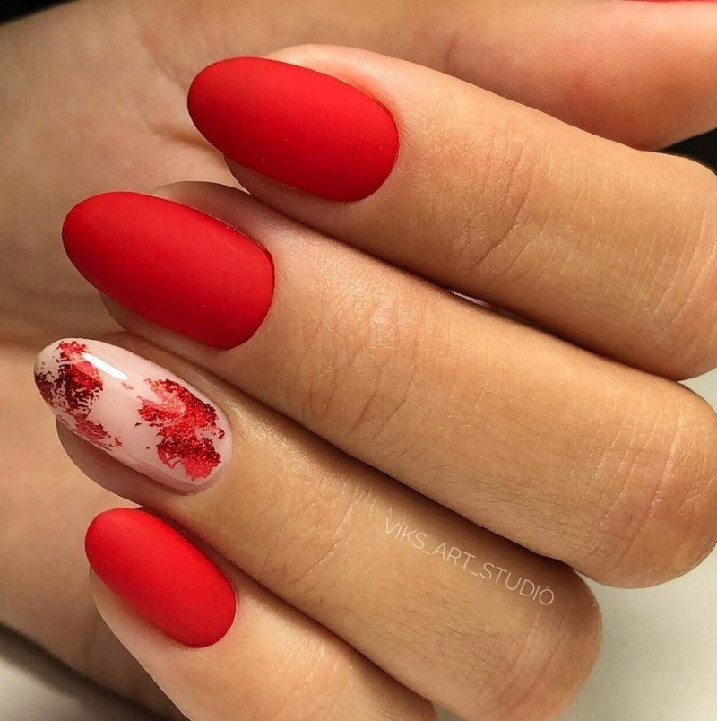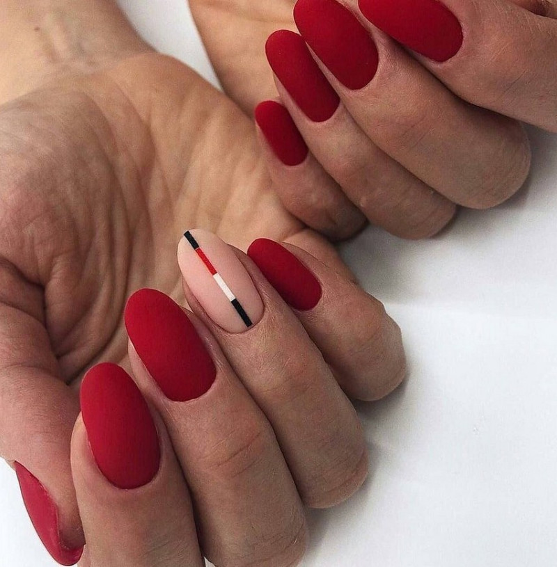 Красный. Этот цвет в любых вариантах считается классикой нейл-искусства. Он всегда актуален и никогда не выходит из моды. Если оттенок кажется слишком ярким, можно нанести на лак специальный топ, придающий вельветовую текстуру.