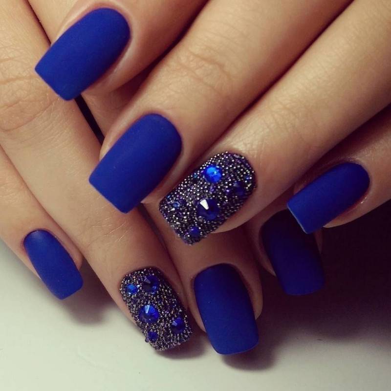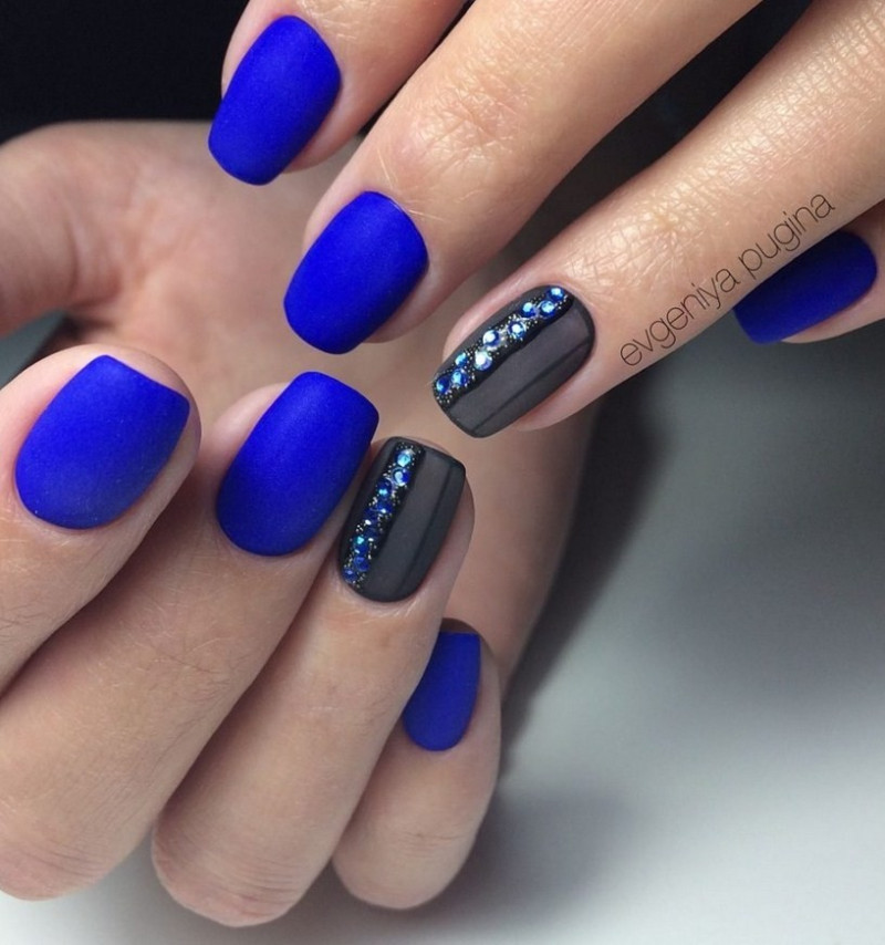 Синий. Тёмный или яркий синий цвет – решение для смелых женщин, которые не ограничены рамками дресс-кода. Но приглушенные варианты с матированием вполне соответствуют деловому образу, выглядят стильно и лаконично. Для яркого праздника стоит выбрать королевский синий в комбинации с золотым.