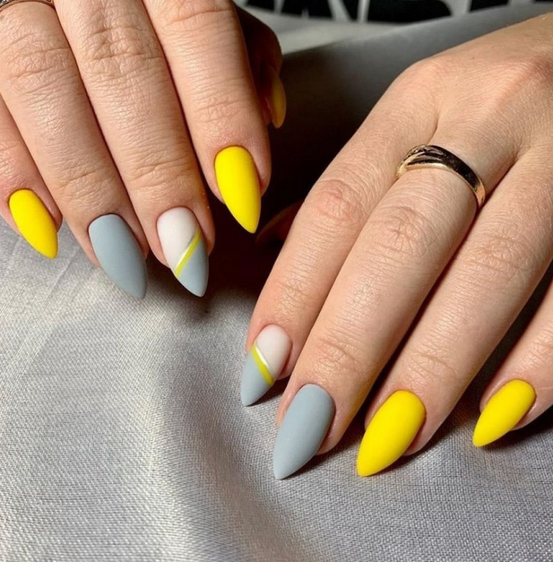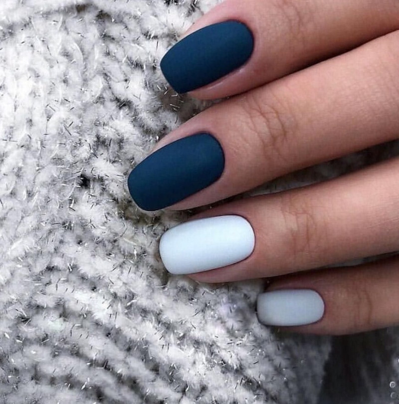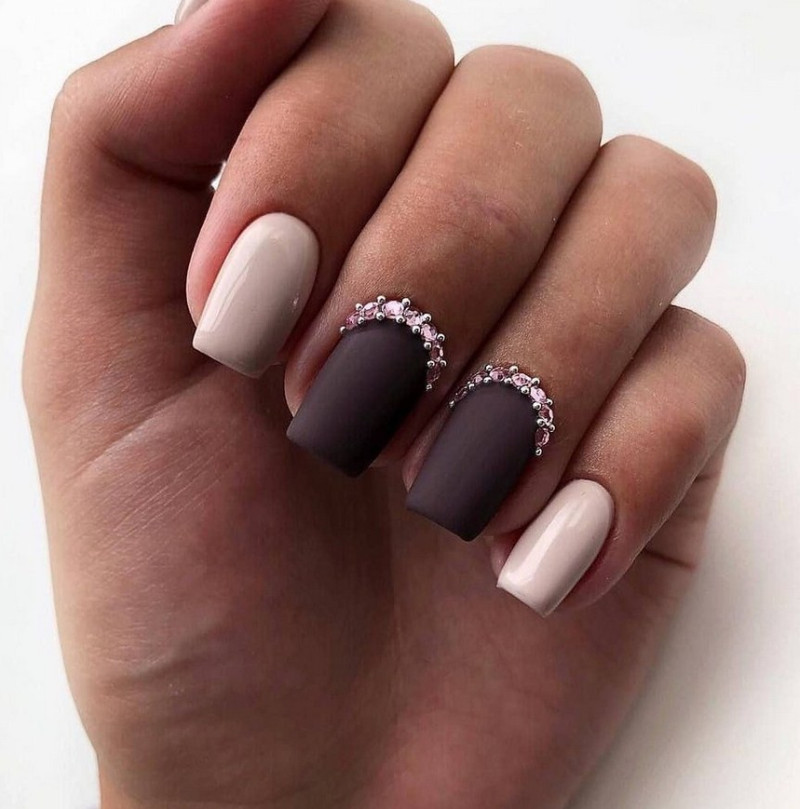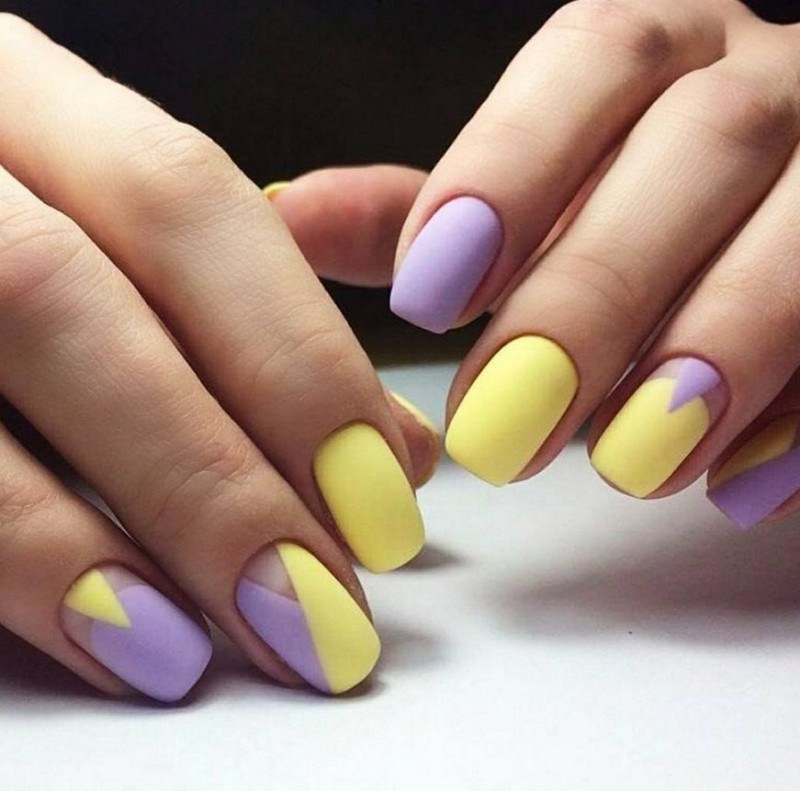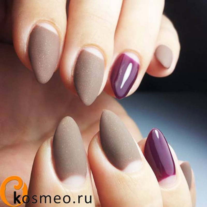 Сочетания двух цветов в матовом покрытии. Самыми стильными и актуальными дуэтами в новом сезоне будут коричневый и розовый, серый и жёлтый, розовый и голубой, терракотовый и зелёный.