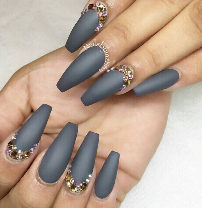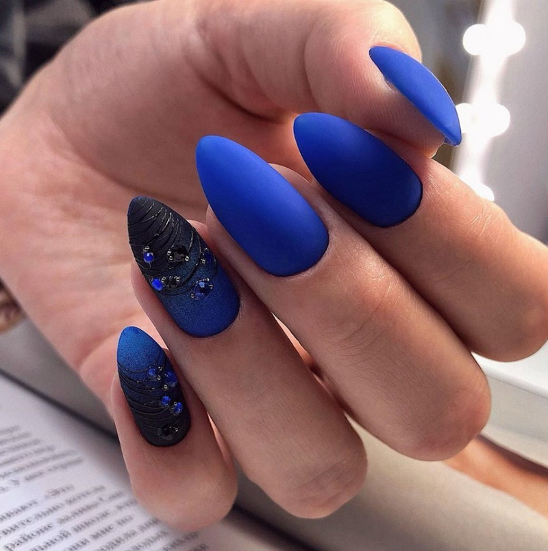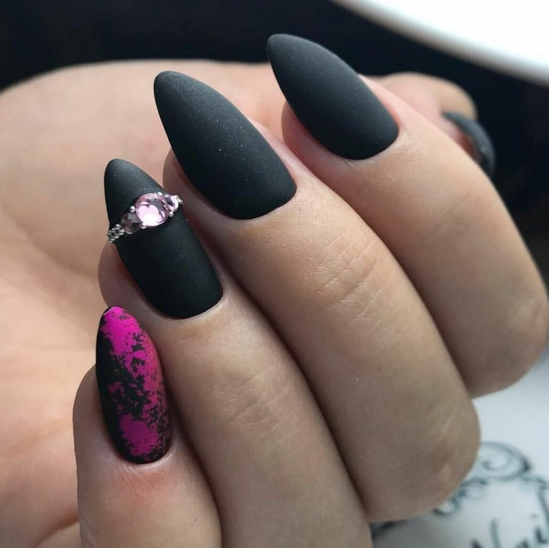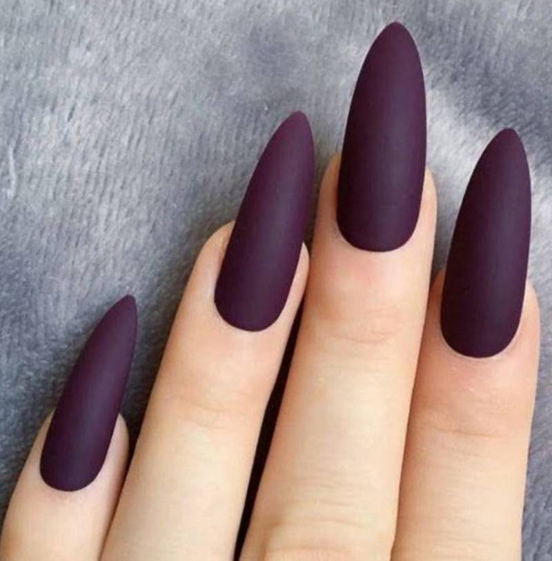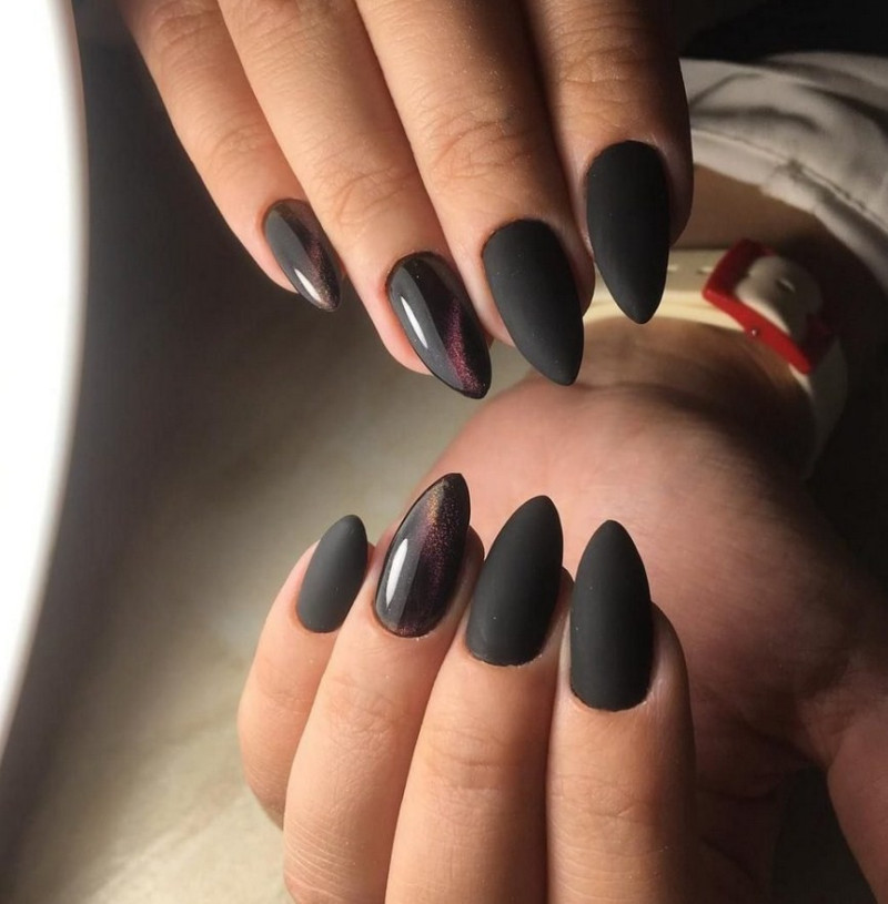 Острые ногти. Такие ноготки обретают изысканный вид с матирующим покрытием. Самые привлекательные и уместные оттенки – чёрный, изумрудный, винный, сапфировый.