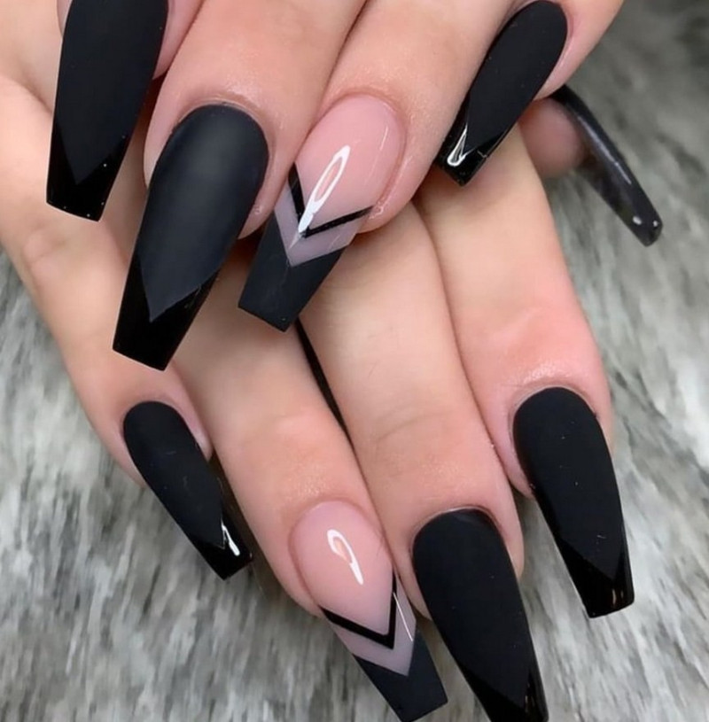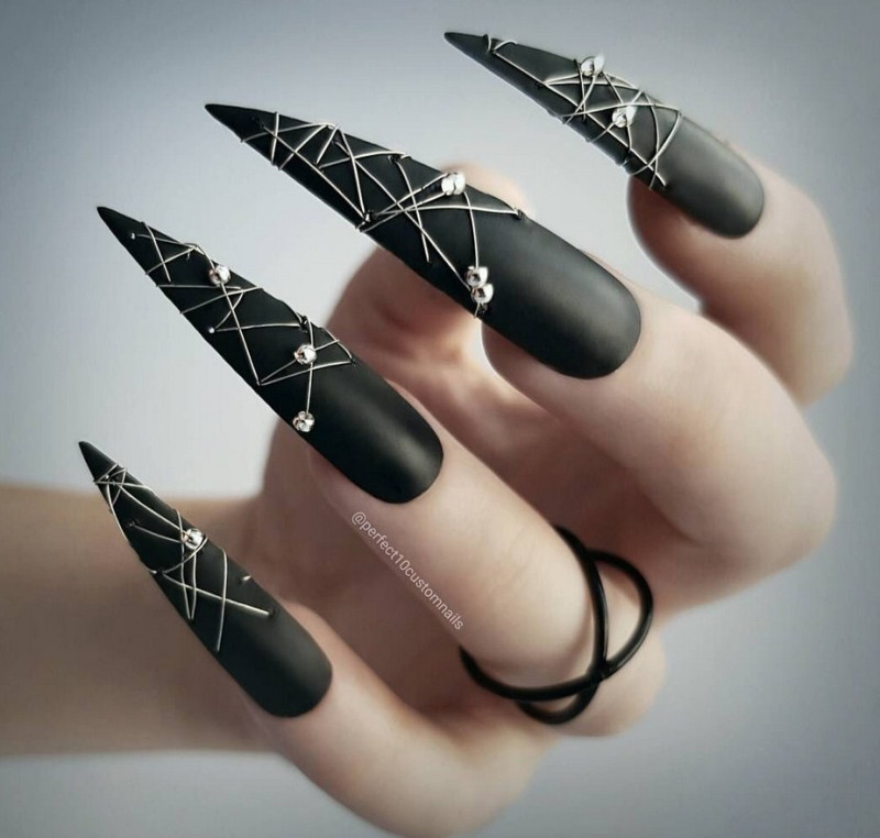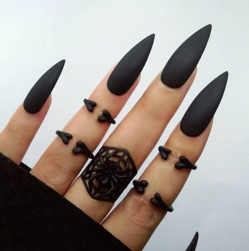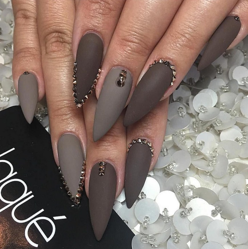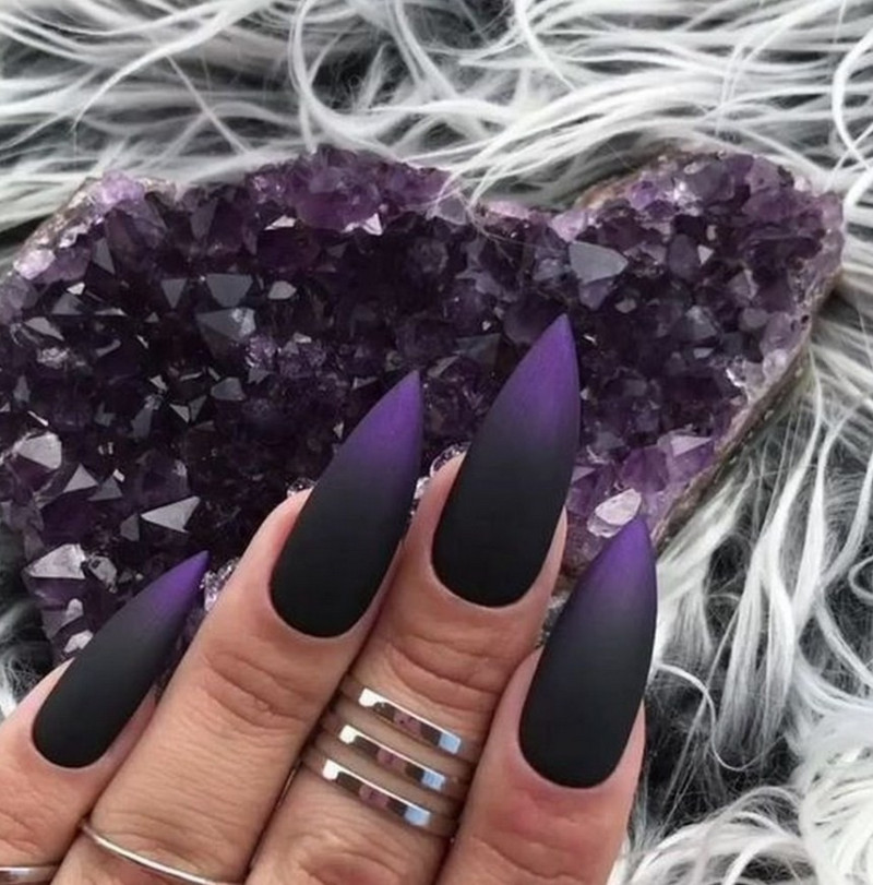 Острые ногти. Такие ноготки обретают изысканный вид с матирующим покрытием. Самые привлекательные и уместные оттенки – чёрный, изумрудный, винный, сапфировый.