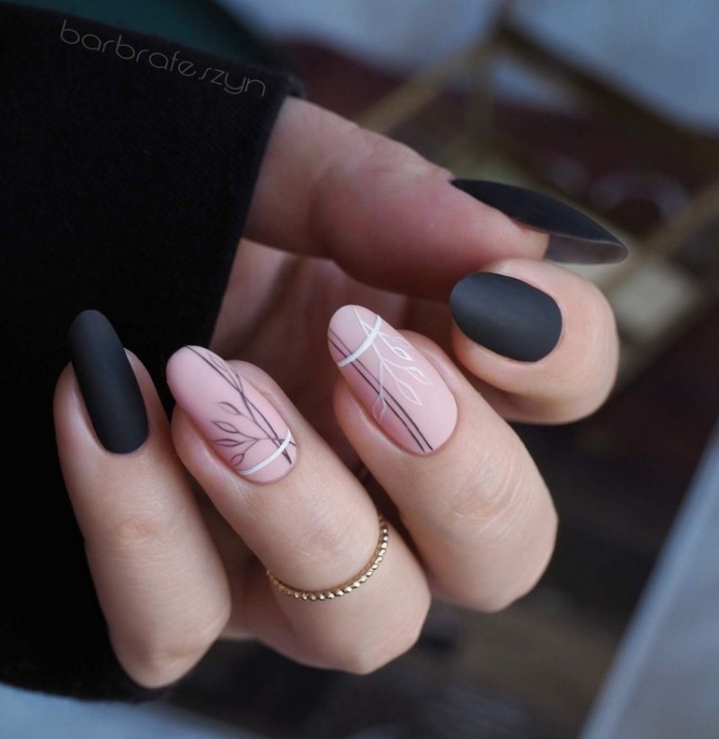 Сочетание матового с глянцевым позволяет создавать на ногтях невероятно эффектные узоры. Можно использовать трафареты или рисовать кисточкой, зубочисткой или дотсом. Особенно красиво этот вид дизайна смотрится с темными цветами лаков.