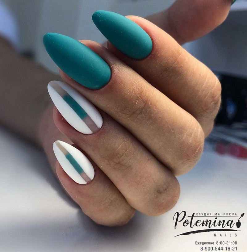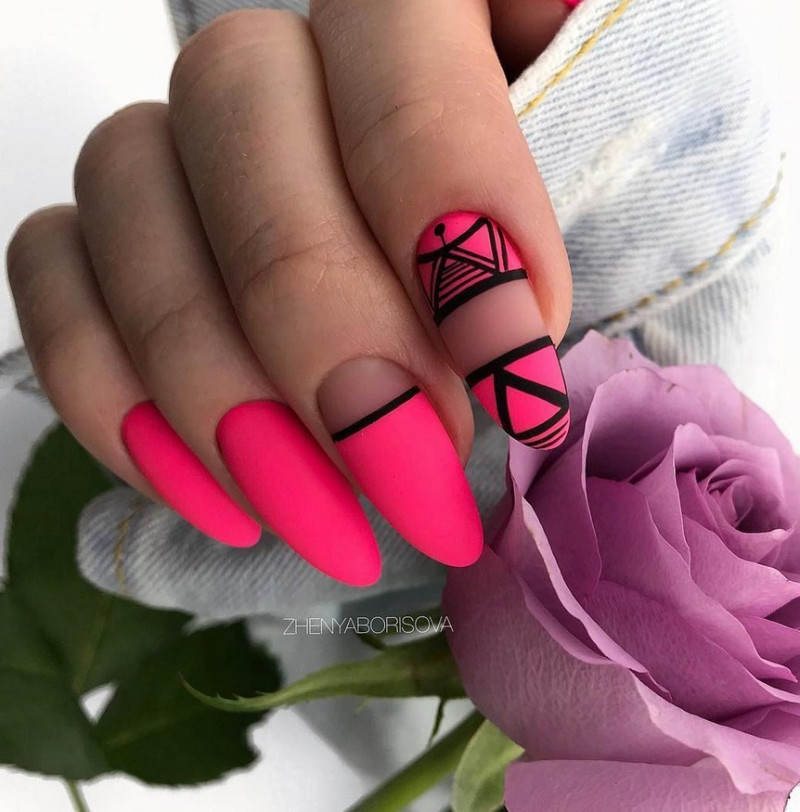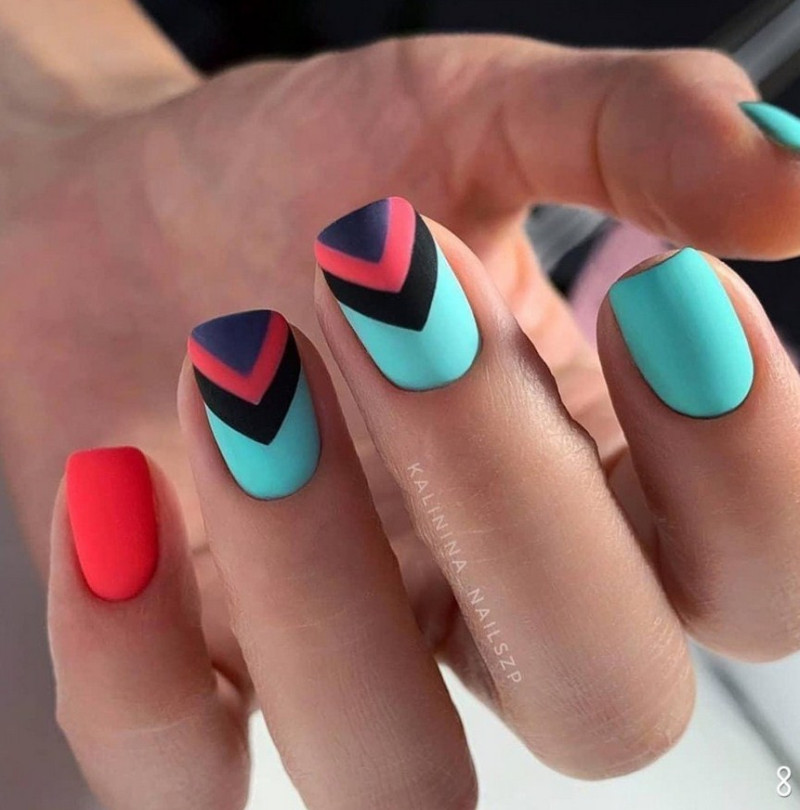 Эффектно смотрятся на ногтях геометрические узоры в матовом исполнении. Выбирайте для маникюра сочные контрастные тона.