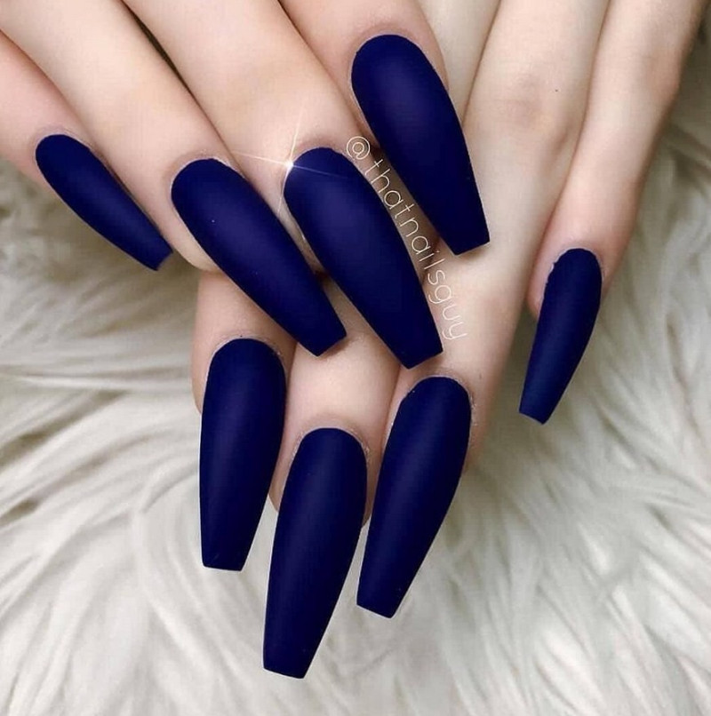 Матовые длинные ногти. На отросших или наращённых ноготках можно применять разные варианты дизайна, экспериментировать с цветом. Они могут быть полностью заматированными, либо включать участки с глянцем, акриловой пудрой, фольгой.