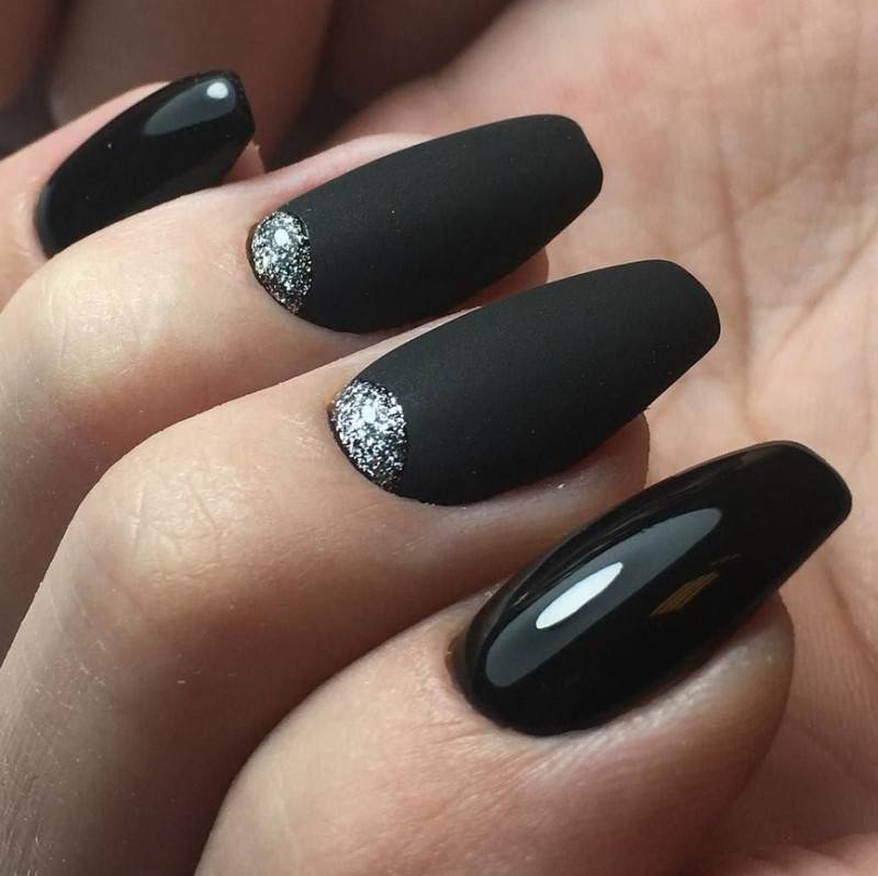 Чёрный. Однотонный чёрный маникюр – выбор смелых дам, которые хотят обрести максимально эффектный образ. Дополнить дизайн можно глянцевыми рисунками или кусочками флока.