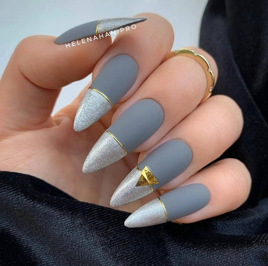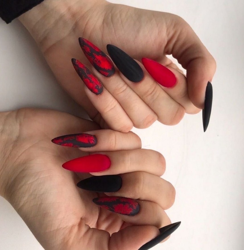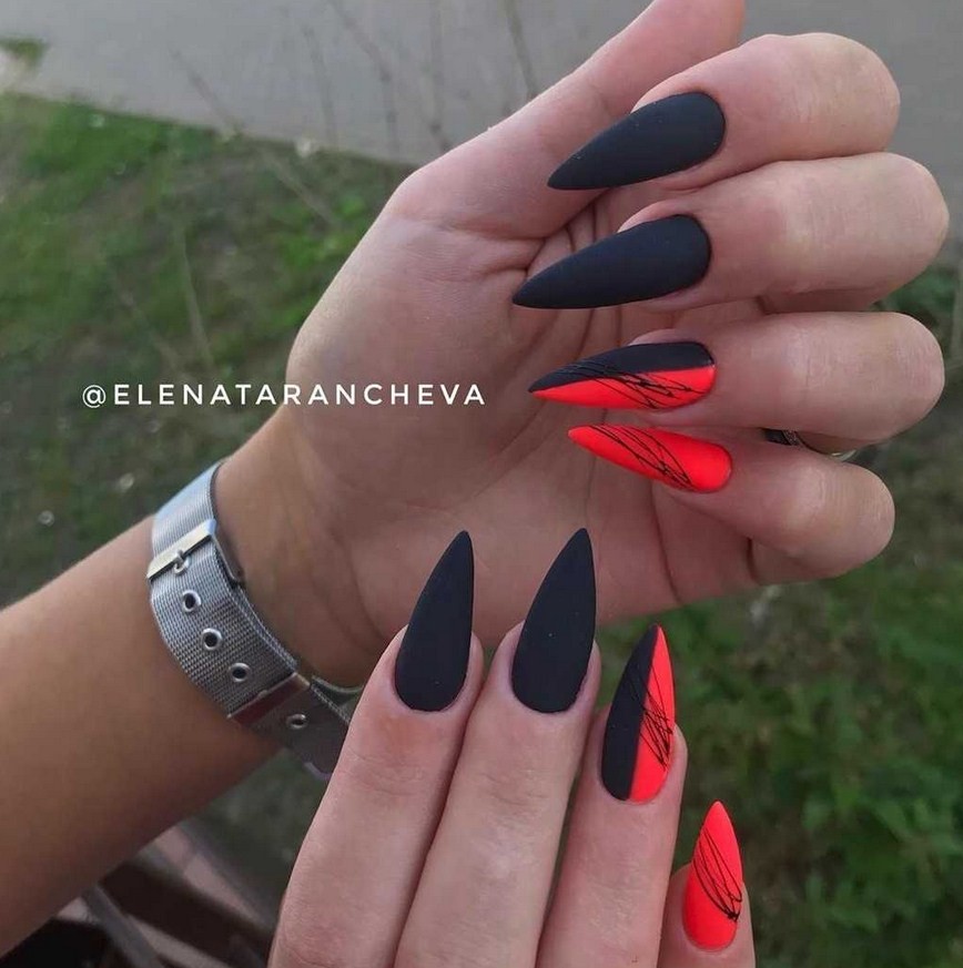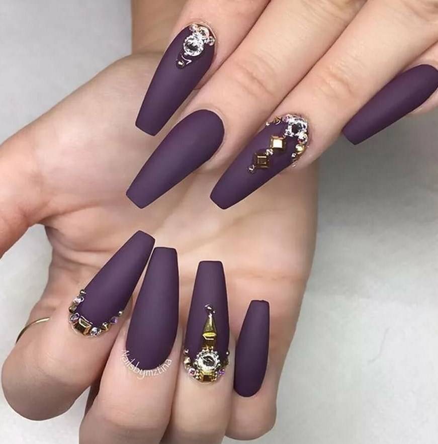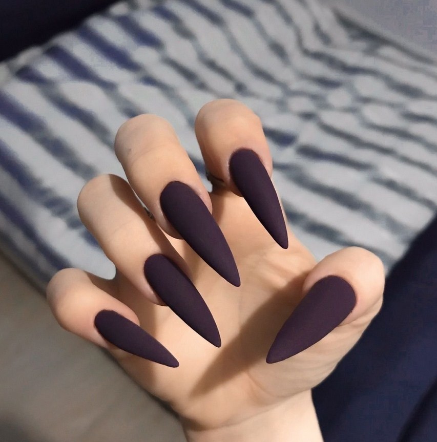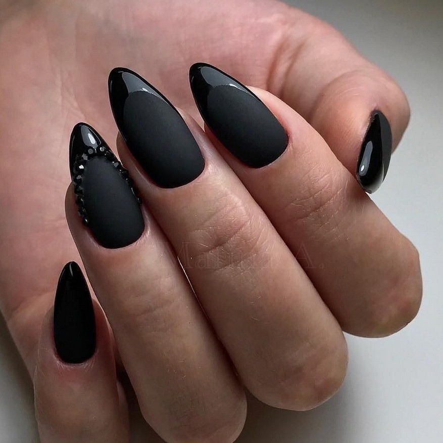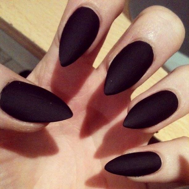 Острые ногти. Такие ноготки обретают изысканный вид с матирующим покрытием. Самые привлекательные и уместные оттенки – чёрный, изумрудный, винный, сапфировый.