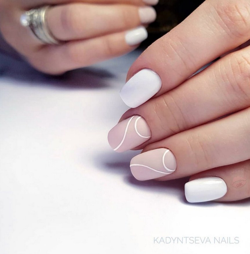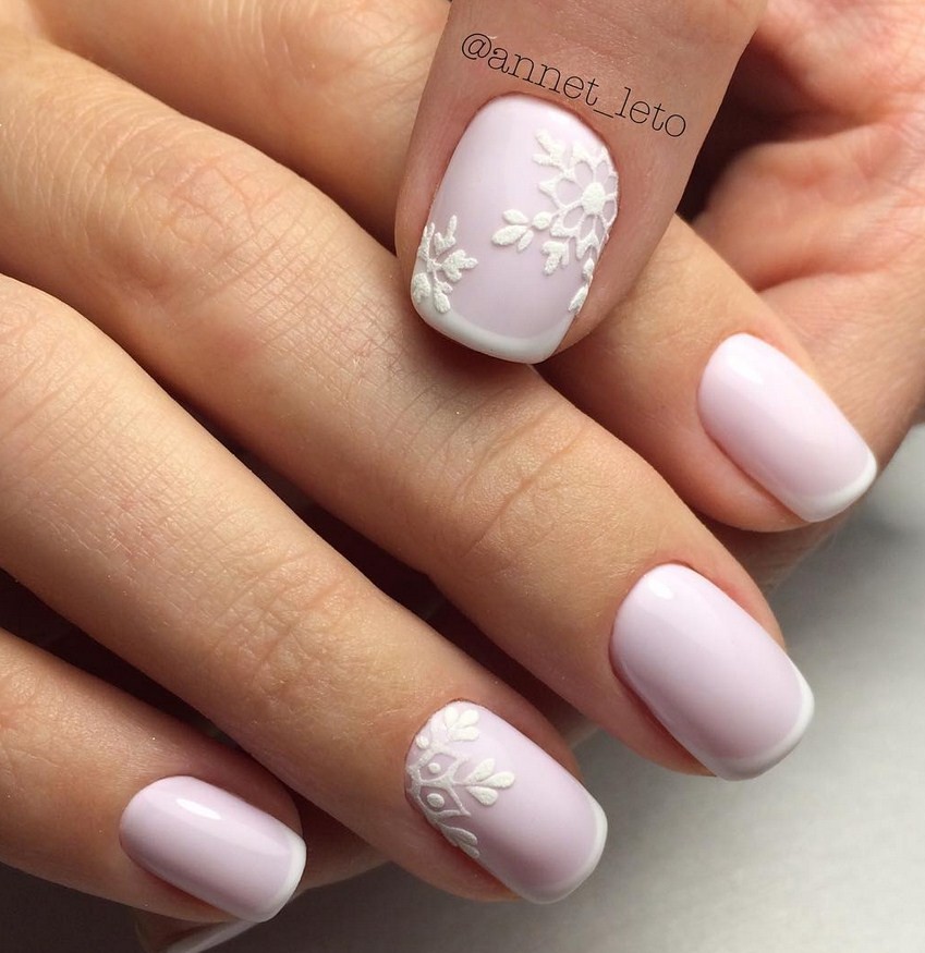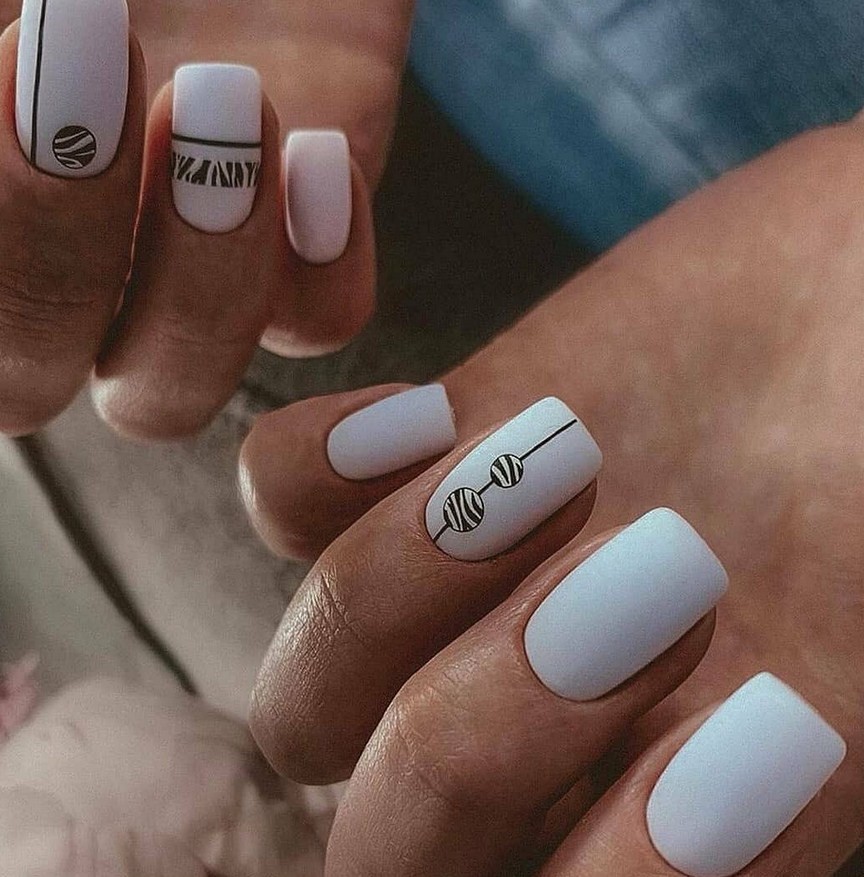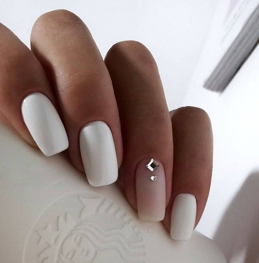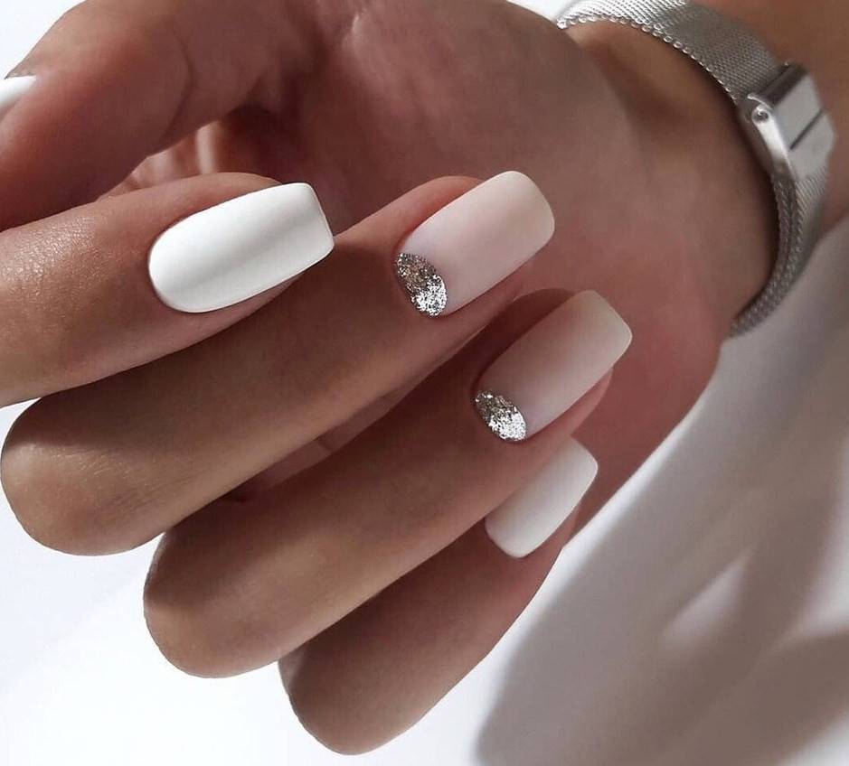 Белый. Этот цвет неизменно считается базовым, он визуально делает ногтевую пластину ровнее, изящнее. Сейчас мода диктует выполнение матирования на ноготках, поэтому все виды маникюра с белым лаком лучше применять именно в такой вариации.