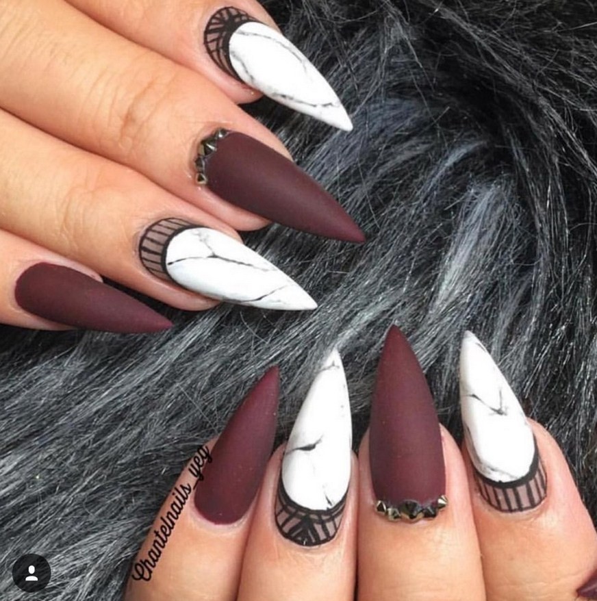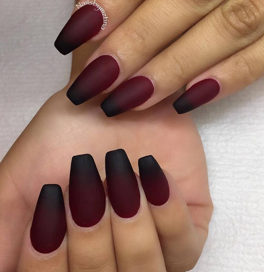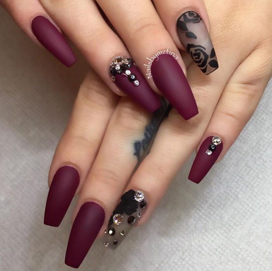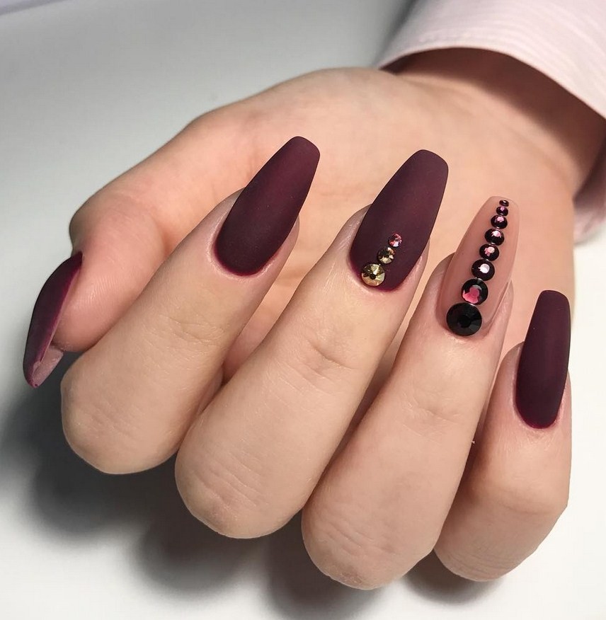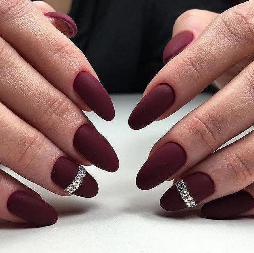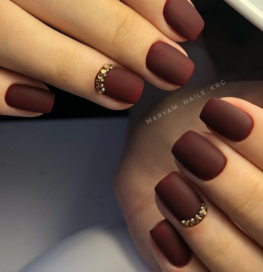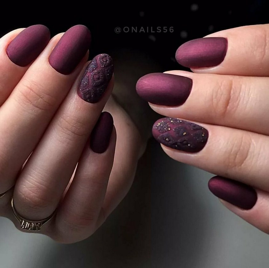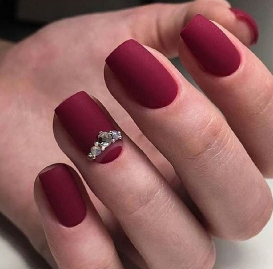 Бордовый. Тёмные, насыщенные оттенки особенно стильно визуализируются именно в матированной версии. Отсутствие блеска смягчает их, делает ещё более изысканными и элегантными. Дополнительно украсить маникюр можно акриловой пудрой.