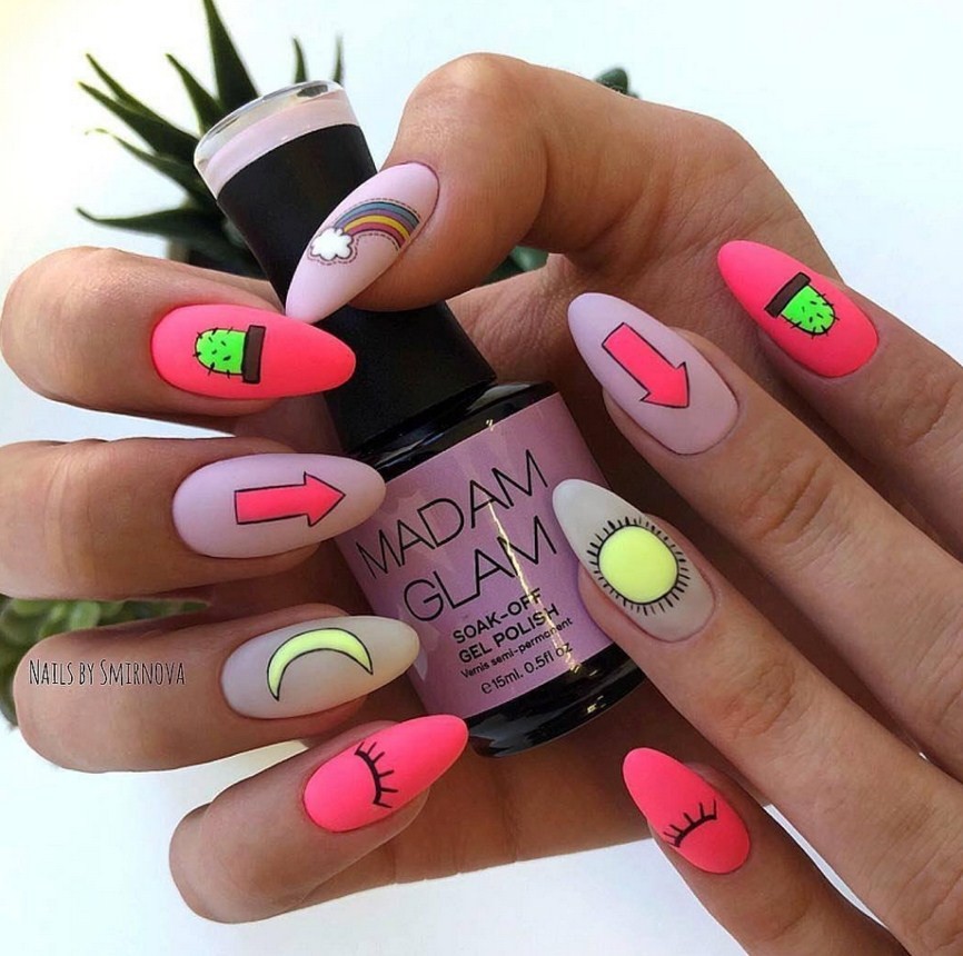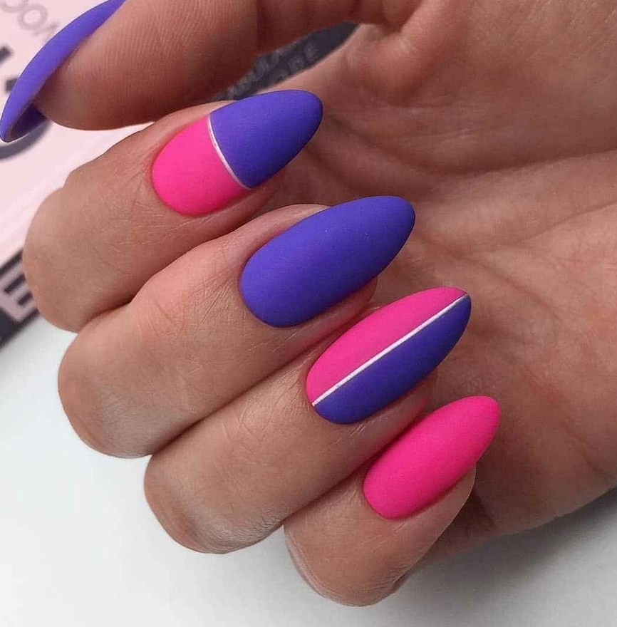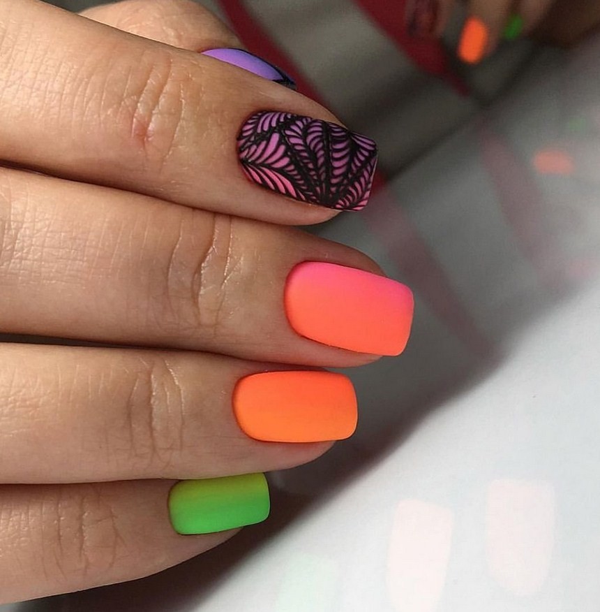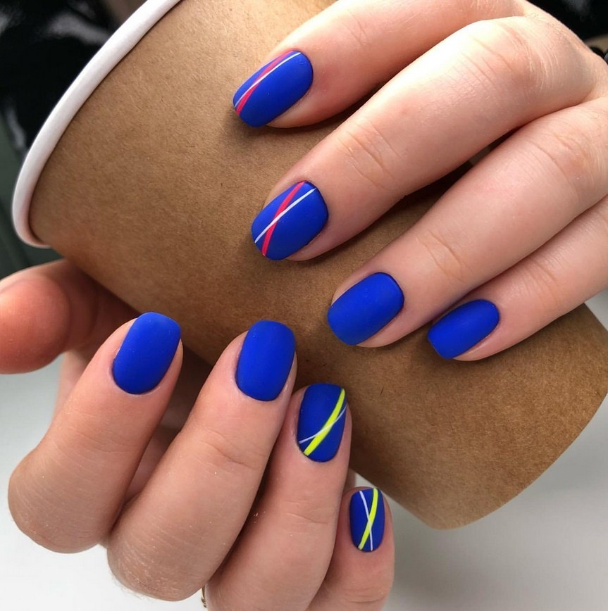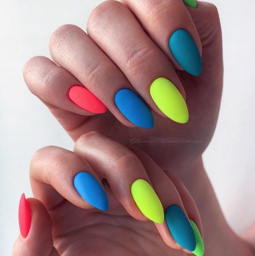 Яркие матовые ногти. Для любителей ярких оттенков мастера предлагают различные неоновые лаки, а также кислотные вариации матового топа. Они сделают дизайн насыщенным и смелым, чтобы его обладательница сразу стала центром притяжения взглядов.