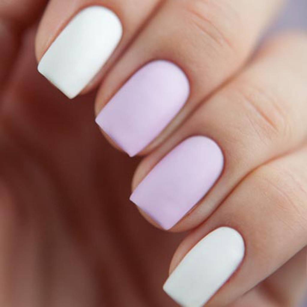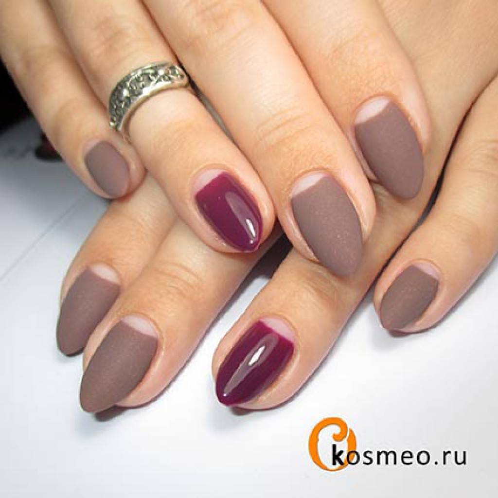 Сочетания двух цветов в матовом покрытии. Самыми стильными и актуальными дуэтами в новом сезоне будут коричневый и розовый, серый и жёлтый, розовый и голубой, терракотовый и зелёный.