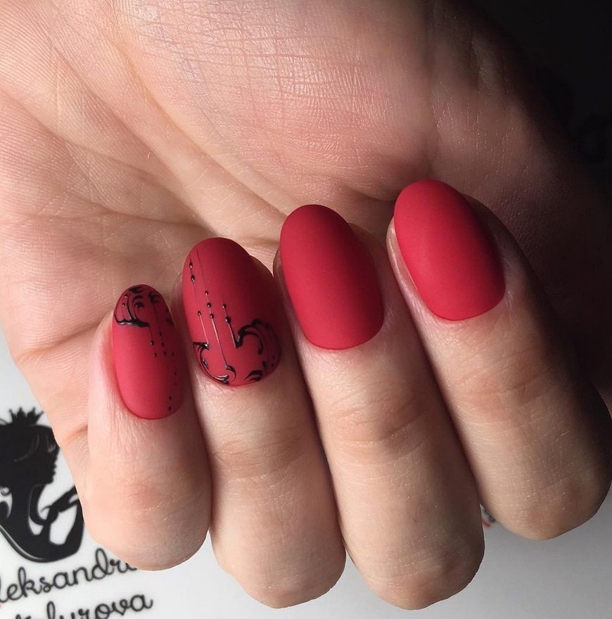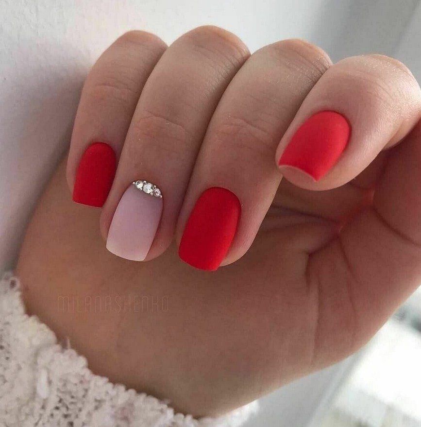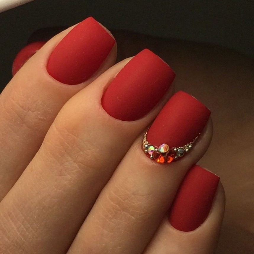 Красный. Этот цвет в любых вариантах считается классикой нейл-искусства. Он всегда актуален и никогда не выходит из моды. Если оттенок кажется слишком ярким, можно нанести на лак специальный топ, придающий вельветовую текстуру.