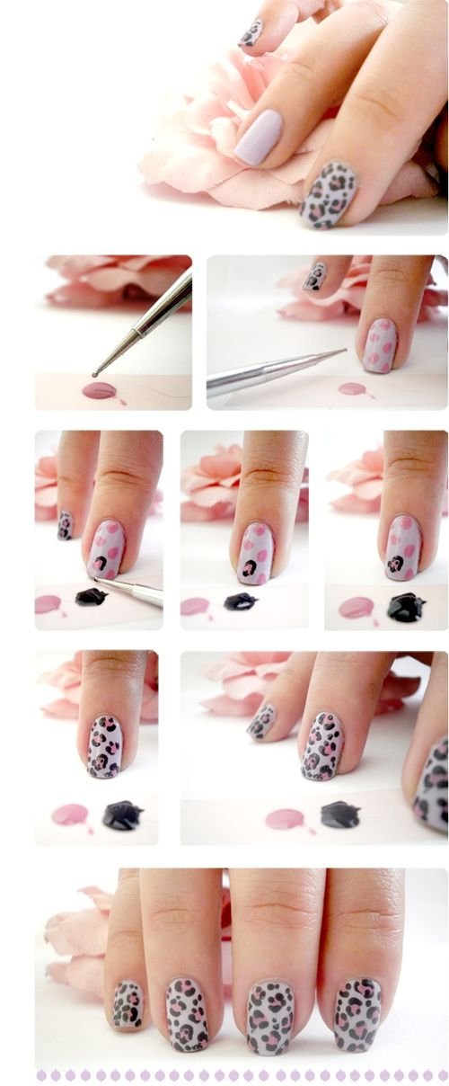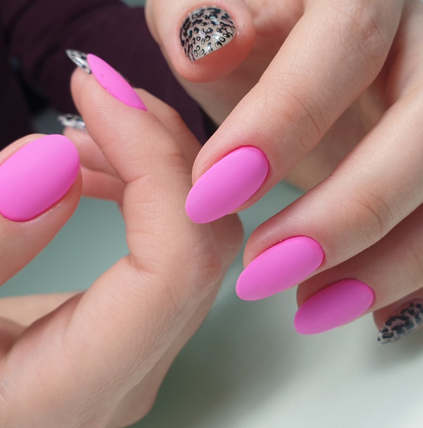 Второй вариант подходит для гламурных девушек: на белом матовом фоне красуются розовые пятна леопарда. Техника выполнения маникюра прежняя.