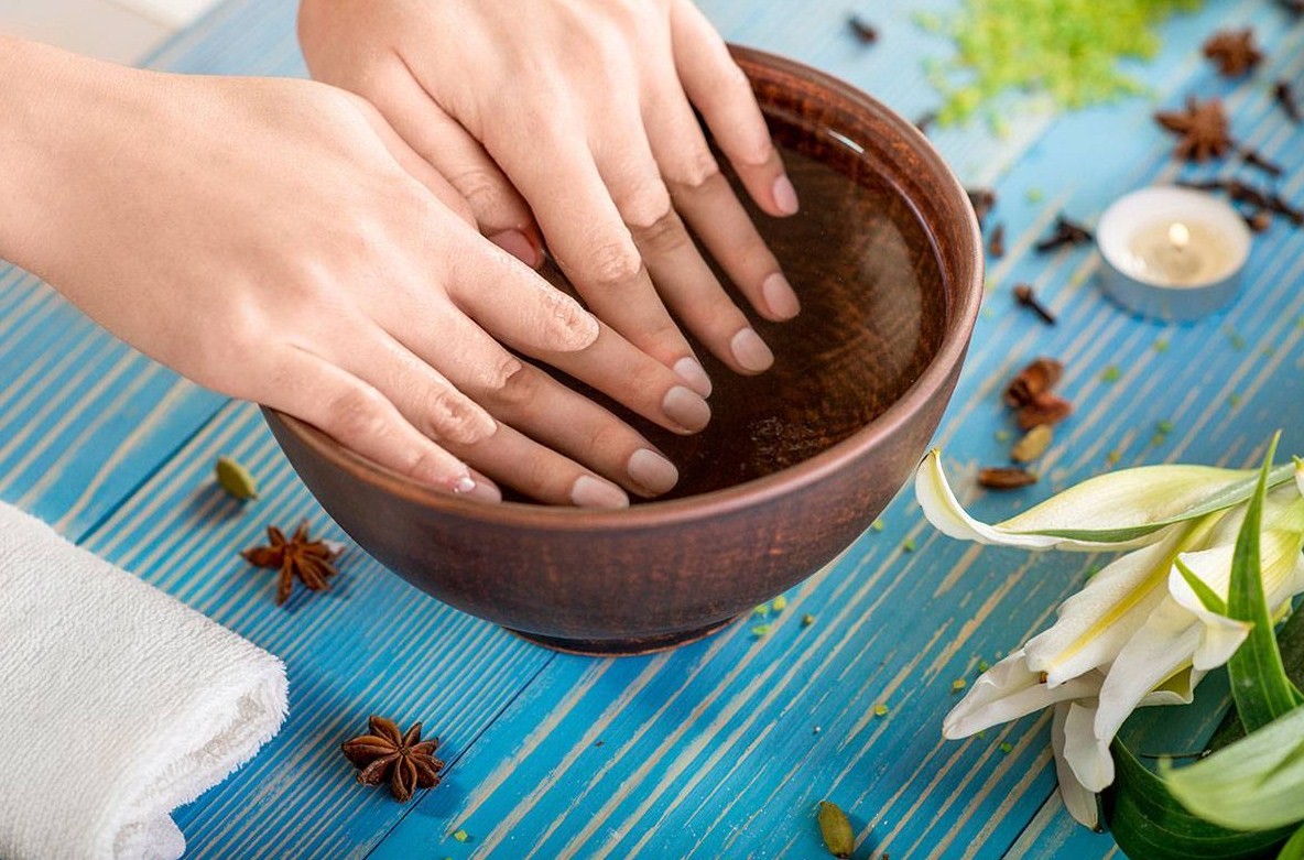 Пальчики погружают в ванночку с тёплой водой на 5 минут, после чего убирают птеригий и обрезают кутикулу. Также можно просто отодвинуть кутикулу апельсиновой палочкой.