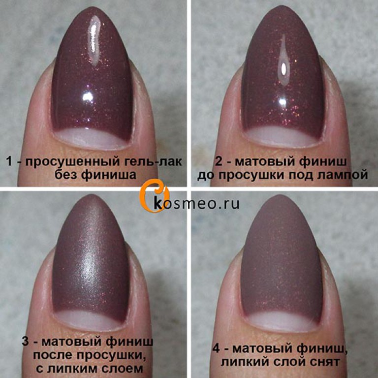 На фото ниже показано, как делаются матовые ногти: покрытие цветным гель-лаком, покрытие финишем, финиш после просушки в лампе в течение 2 минут и финиш после снятия липкого слоя (то есть, окончательный результат)