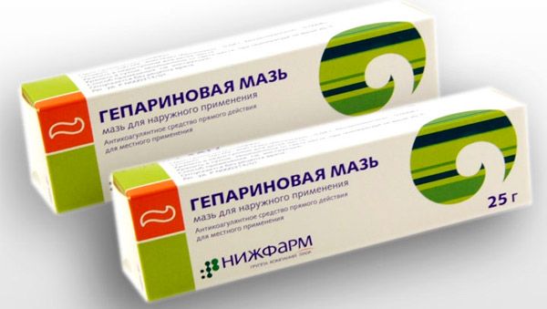 - Гепатромбин. Препарат содержит: гепарин (300 или 500 МЕ в зависимости от дозировки), декспантенол (4 мг), аллантоин (3 мг), а также воск, карбомер, парафин, вазелин, левоментол, глицериды жирных кислот, пурцелинол, троламин, динатрия эдетат. Гель оказывает антикоагулянтное, регенерирующее, противовоспалительное и противоотечное действие, препятствует образованию тромбов.