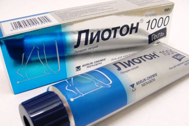- Лиотон-гель. В состав входит гепарин (1000 МЕ), метилпарабен, пропилпарабен, этанол, лавандовое и нероловое масло, триэтаноламин, карбомер. Лиотон эффективно устраняет отечность, снимает воспаление, разжижает кровь.