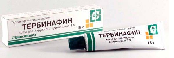 «Тербонафим». Применяется для лечения грибковых поражений ногтей, кожных покровов, при инфекциях кожи, вызванные дрожжевыми грибками, для устранения разноцветного лишая. Его активный компонент изменяет процесс биосинтеза в клетках грибов и приводит к их гибели. Длительность применения мази – от двух недель до месяца.