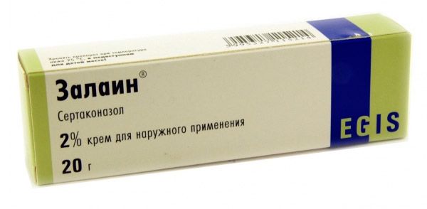 «Залаин». Активное вещество – сертаконазол нитрат. Предназначен для лечения грибковых инфекций. Продолжительность применения зависит от степени поражения. Как правило, заметное улучшение наблюдается на второй недели лечения. Чтобы полностью избавиться от грибка следует применять мазь в течение месяца.