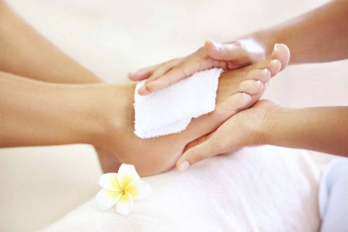 Техника проведения процедуры подразумевает несколько этапов. Сначала ноги обрабатывают дезинфицирующим составом широкого спектра действия