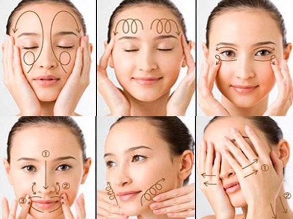 — затем плавные движения становятся более активными и меняют направление от центра подбородка к мочкам ушей, затем от уголков рта, к центру губ и крыльям носа. Потом таким же образом прорабатывается нос и лоб. Дальше нужно немного успокоить кожу с помощью плавных поглаживаний и постукиваний пальцами. Затем прорабатывается нежная кожа в области век — эту зону похлопывают круговыми движениями по часовой стрелке;