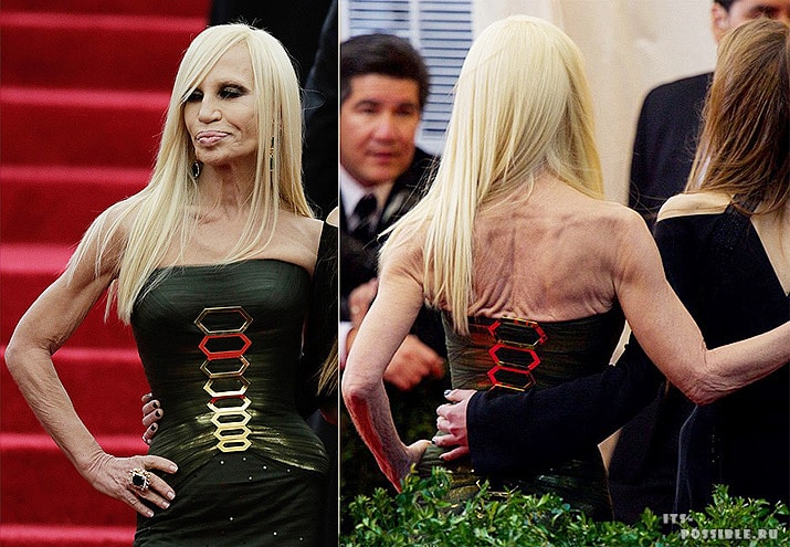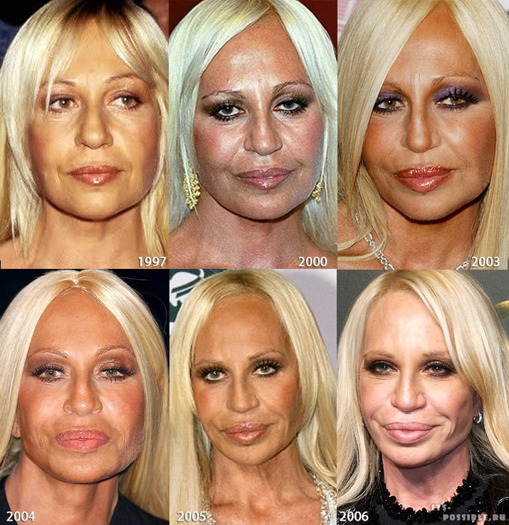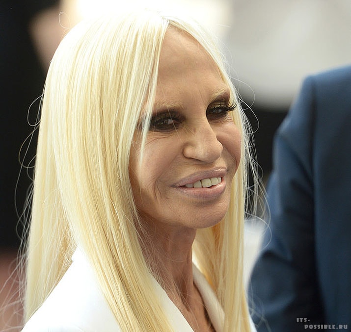 Донателла Версаче – директор Дома Версаче и главный дизайнер. В результате большого количества пластических операций её внешность из обычной и вполне симпатичной стала странной, а иногда даже пугающей.