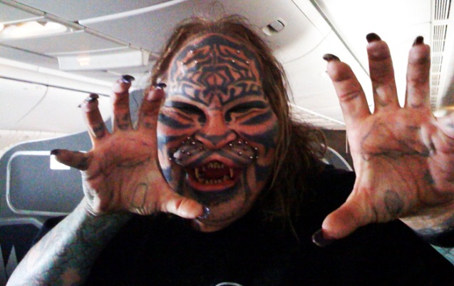 Затем последовала череда многочисленных татуировок. Чтобы уподобиться ящерице, Спрэг прибегнул к помощи пластических хирургов, которые ввели ему в область каждой из бровей по пять тефлоновых имплантатов, имитирующих морду рептилии.
