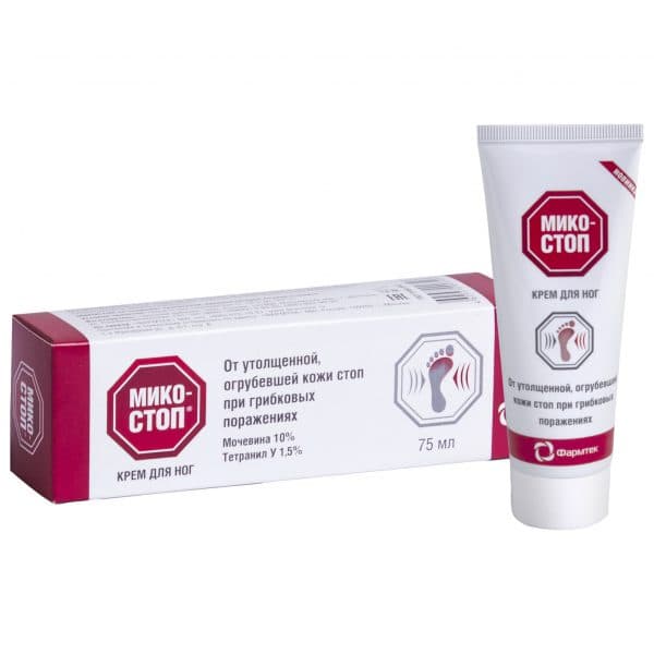 Для обработки ног с целью профилактики, а также для устранения грибка и гиперкератоза стоп предназначен Микостоп крем. Комбинация активных веществ (мочевина и тетранил) обеспечивает глубокое проникновение средства в слои кожи. Средство наносится 2 раза в день до полного выздоровления. Огрубевший слой исчезает спустя 7-14 дней регулярного применения.